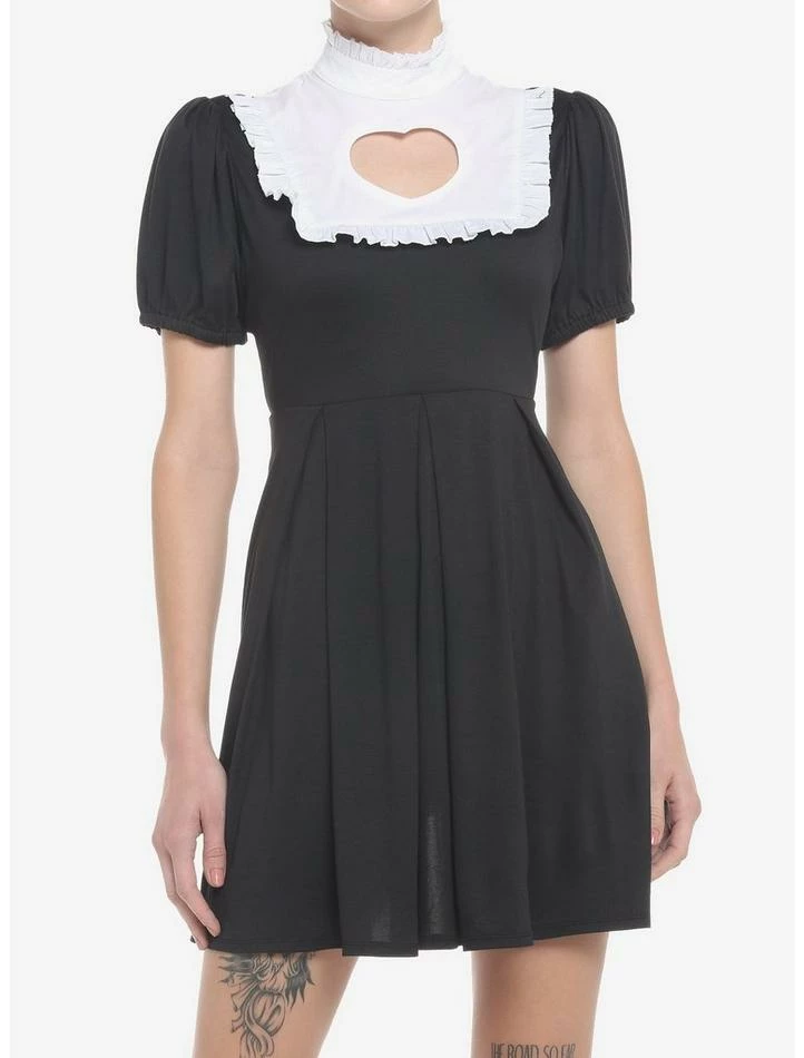 Wanna stay on trend while keeping your look proper? This black mini dress has puff sleeves and a white ruffled neckline with a high neck and heart-shaped cutout. There are also pockets.