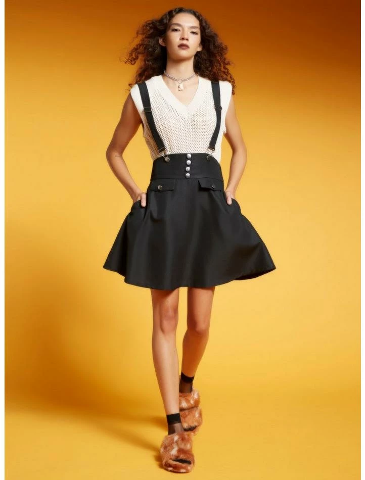 Look cute as a button with this suspender skirt! Comes adorned with four decorative buttons for a high-waisted look and decorative pocket flaps for some dimension. Features side pockets, side zipper, adjustable suspender straps and a bow on the back!