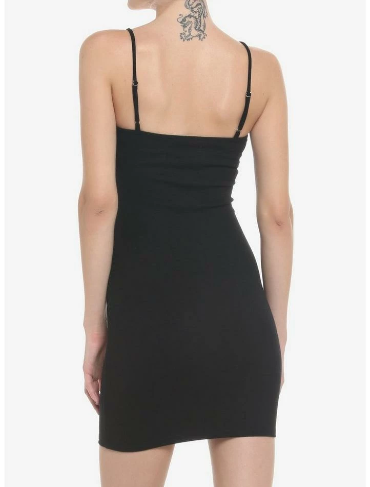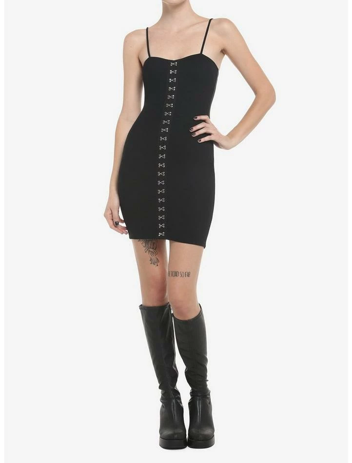 Love the look of hook-and-eye detailing? It adds an edge to any piece — as seen on this bodycon mini. It will add some flair to your LBD collection!
