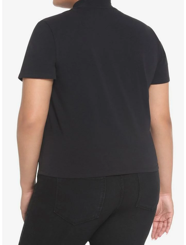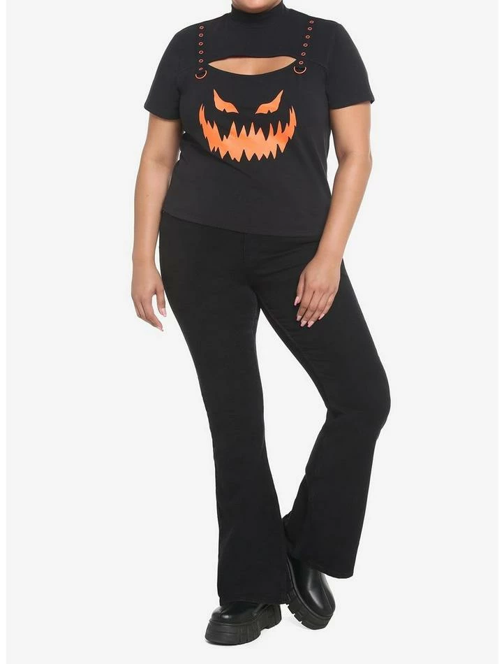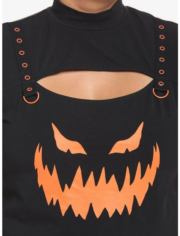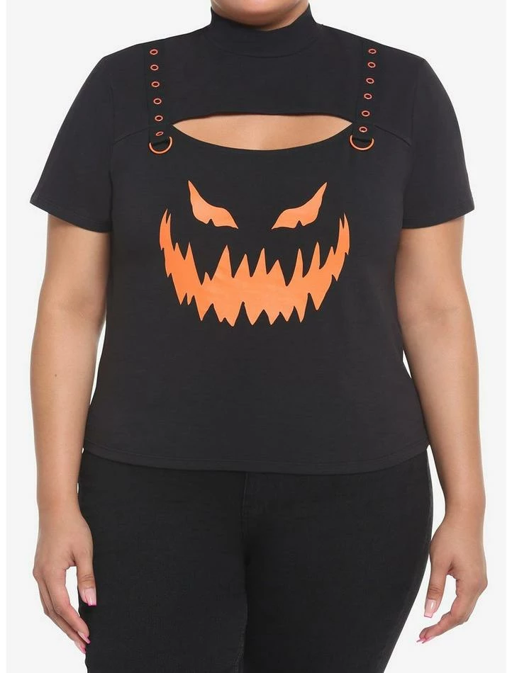 It’s never too early for Halloween. Squash all the haters in this festive tee! This black shirt has a fitted silhouette and features orange-tone grommet and D-ring detailing at the shoulders. Complete with a cutout at the chest, mock neck and an orange jack-o’-lantern face grinning on the front.