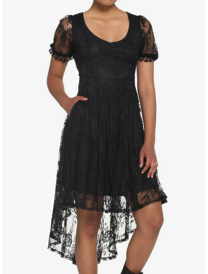 Add some dark romance to your closet with this black dress featuring a lace overlay, hi-low hem, puff sleeves and side zipper closure.