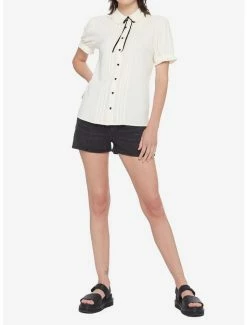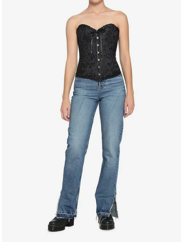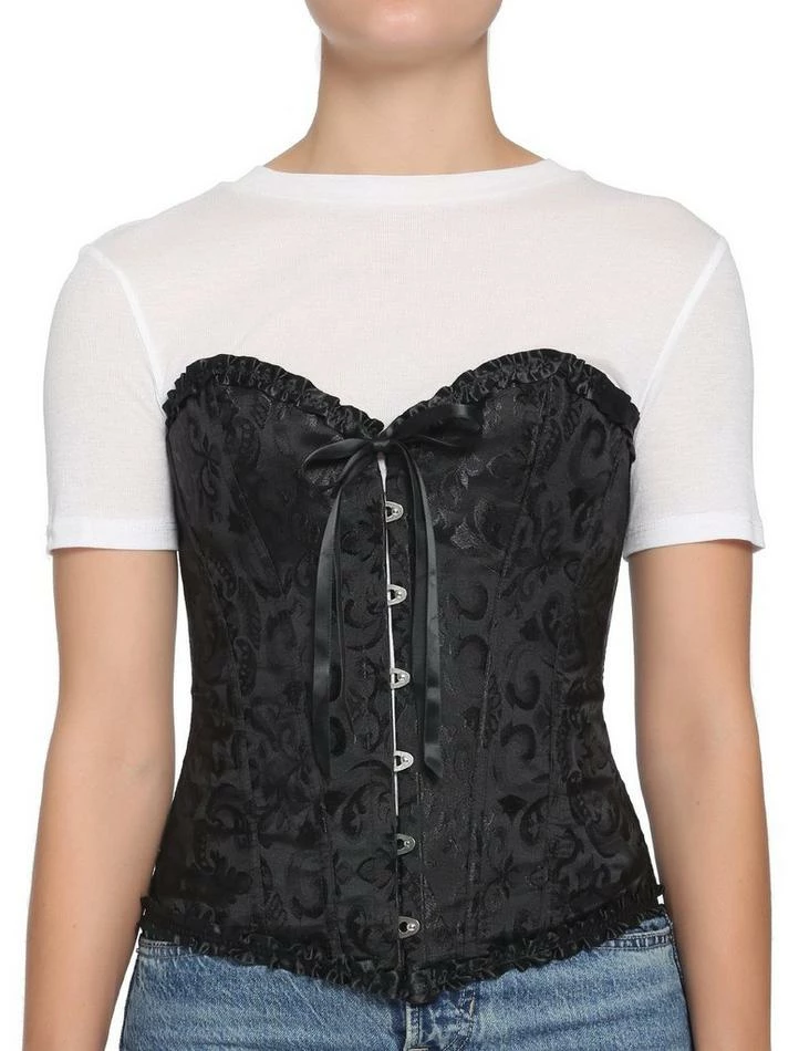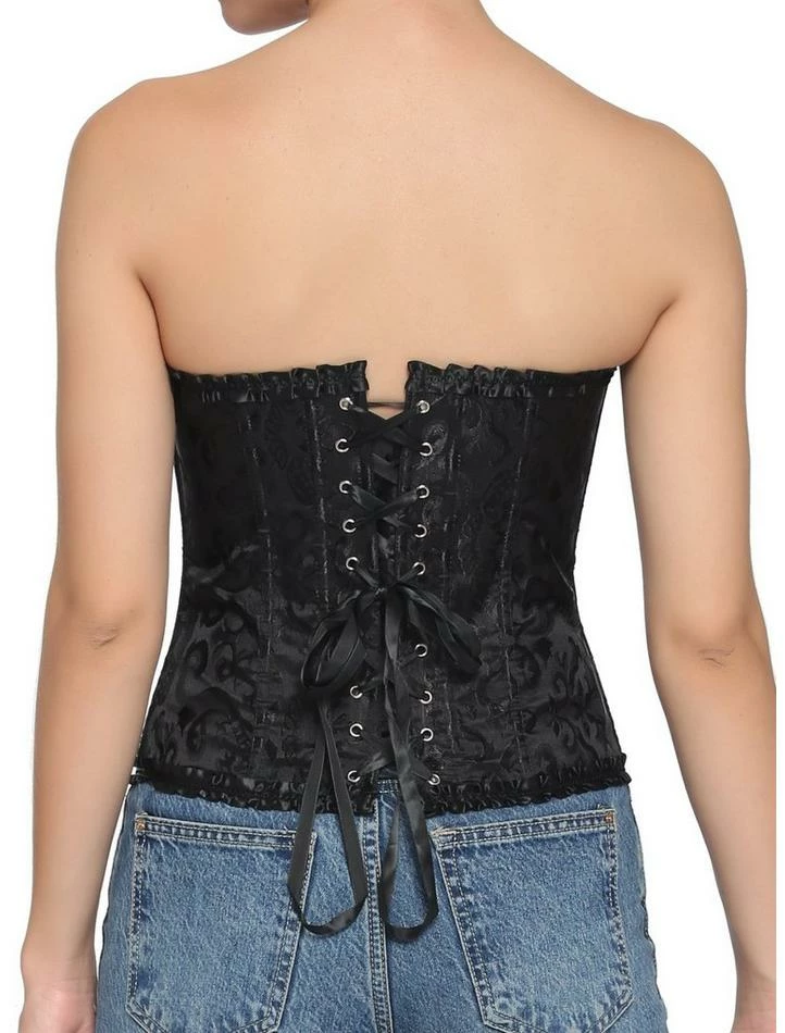 The decision to get this bustier is a cinch! Black lace bustier features tie front closure, ruffle trim, lace-up back and hook ‘n’ eye front.