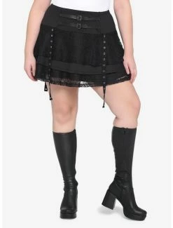 This isn’t your ordinary black skirt. Its details make it a little bit goth, a little bit dark fairy: front adjustable buckles, hanging grommets, tiered lace layers and a back yoke panel. Add to closet ASAP.