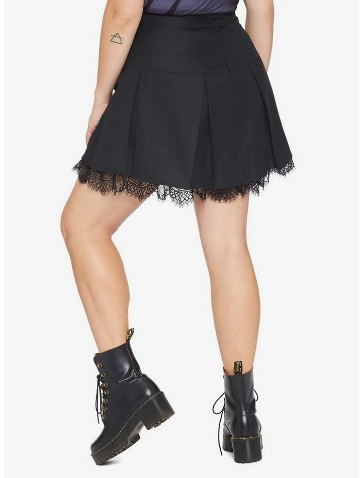 Up your black skirt game with this one featuring black lace trim, pleats, two black satin bows on the sides and back zipper closure.