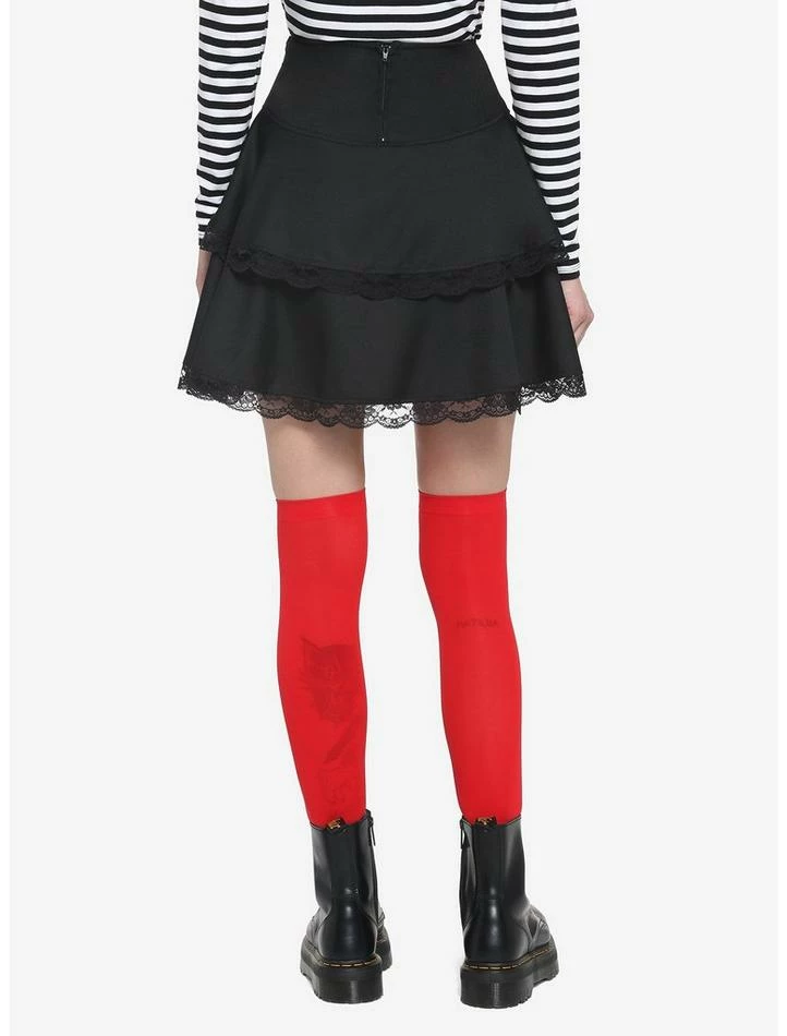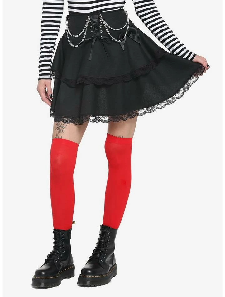 It’s all in the details. This black, tired skirt is sure to elevate your look! It features delicate lace trimming and lace-up detailing on the front. Comes with satin bow detailing at the hip and removable, double chains at the waist. Complete with a back zipper closure.