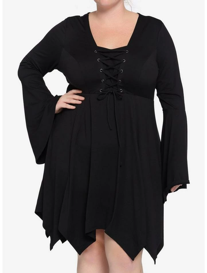Show off your bewitching good looks with this little number. Black dress features bell sleeves, front lace-up details, hanky hem and super soft fabric – because being a baddie shouldn’t come at the expense of comfort!