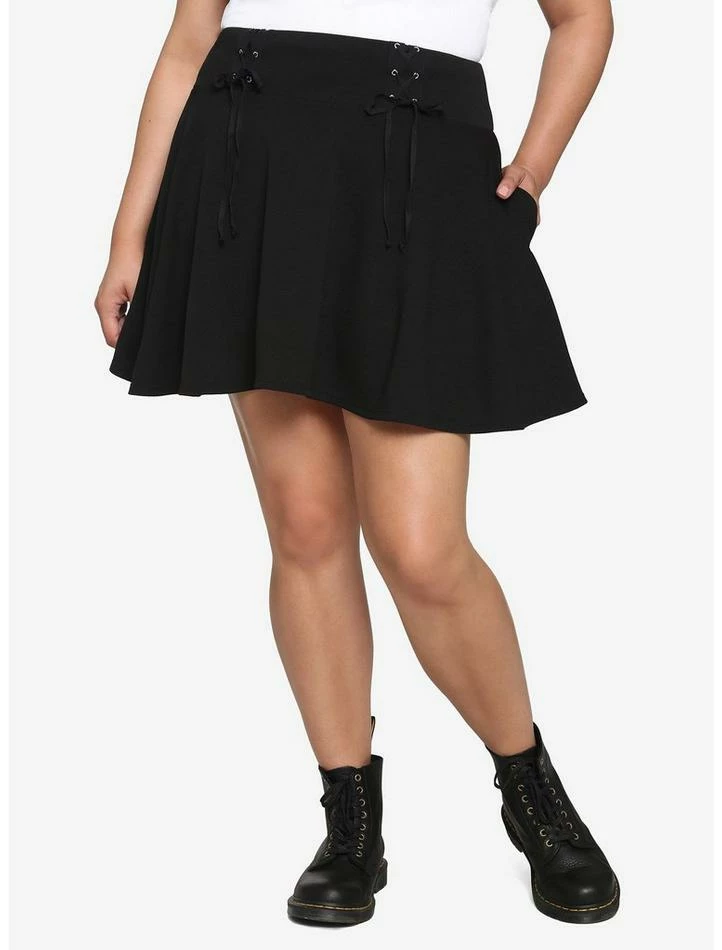 Lace your way to looking lovely with this black skater skirt! Twirl around with this wardrobe staple, featuring lace-up details down the front on both sides, an elasticated waistband and hip pockets.