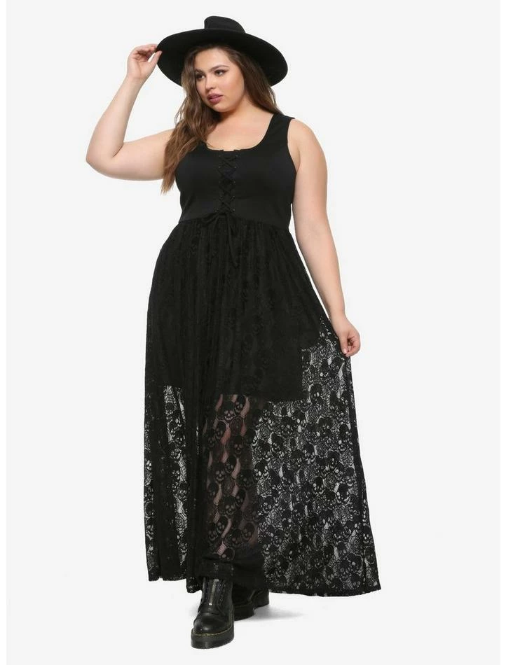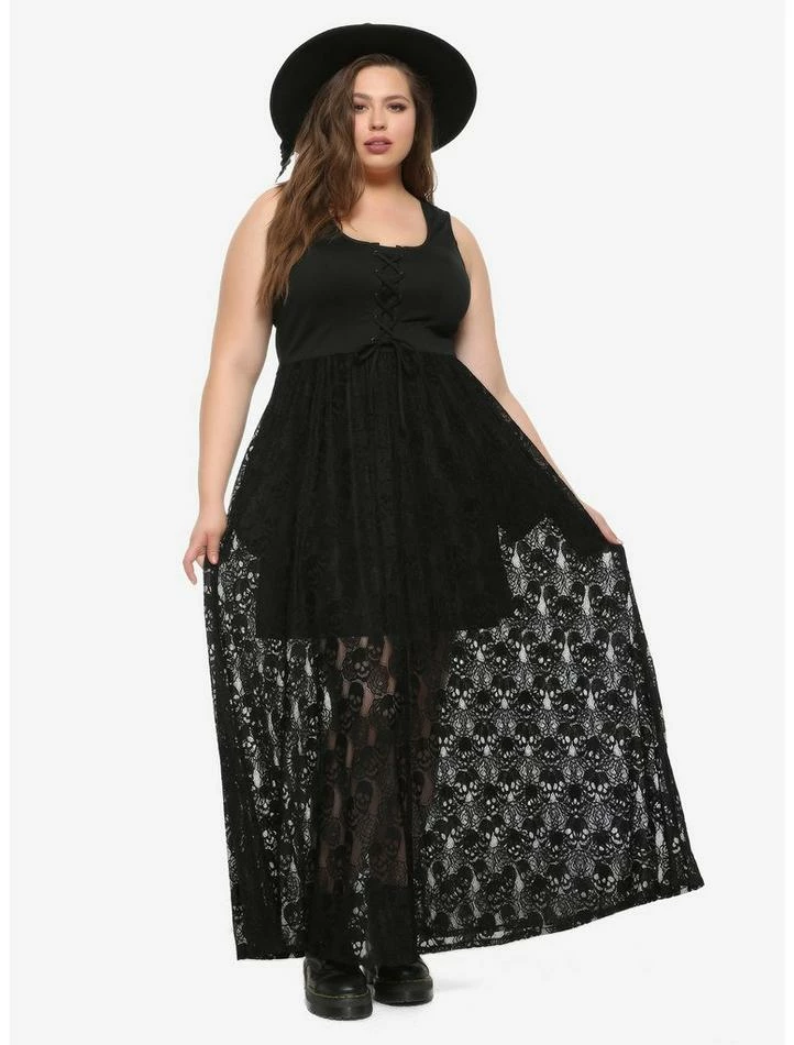 Get the Gothic layered look in an instant with this elegant lace dress. The longer lace layer features an allover skull design with hip pockets. Featuring a shorter black lining and a lace-up front on the bodice.