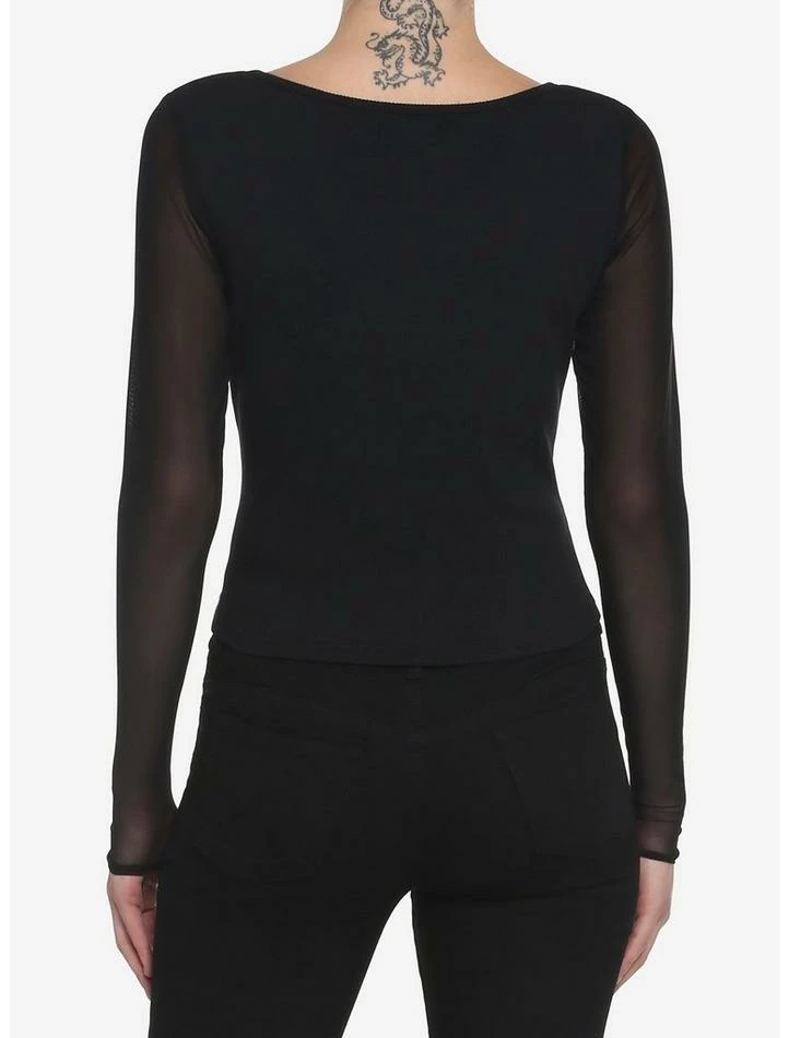 Get the corset look in a more comfortable way. This black top features a fitted bodice with mesh long-sleeves. Complete with a square neckline.