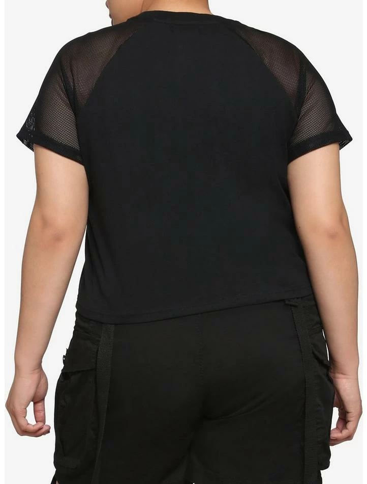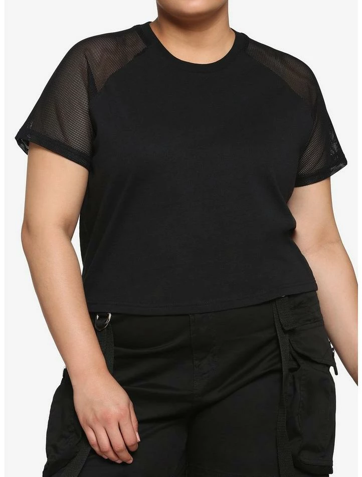 Keep your all-black looks alive in the summertime with this black top featuring black mesh raglan sleeves.ย