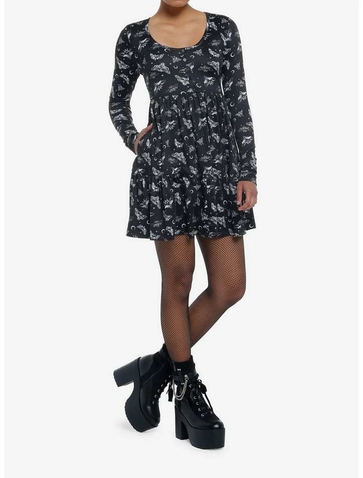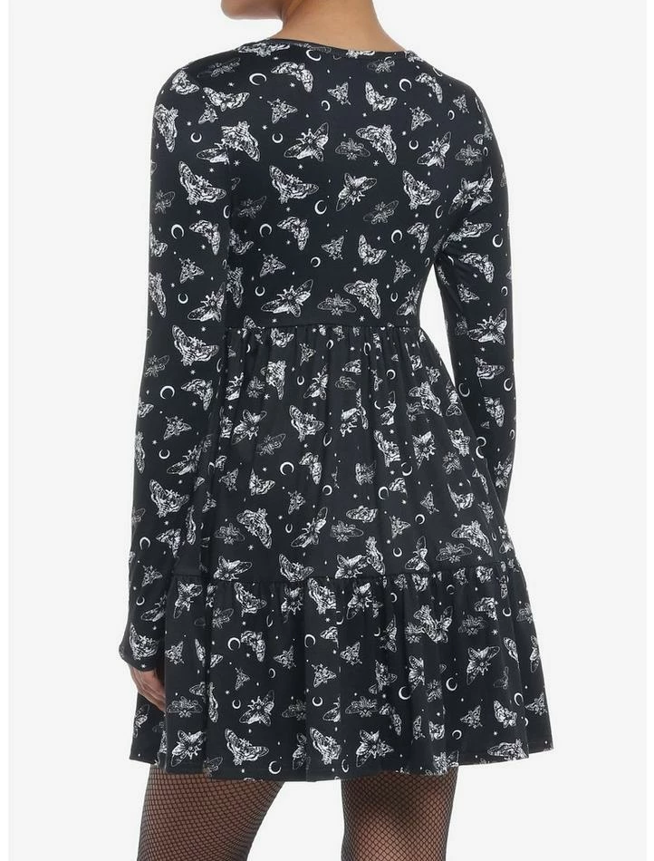 Something celestial is fluttering its way into your wardrobe! Keep your closet bewitching with this long-sleeve tiered dress, featuring an allover print of crescent moons and Death’s-head hawkmoths. Comes with pockets and buttons down the center bust.