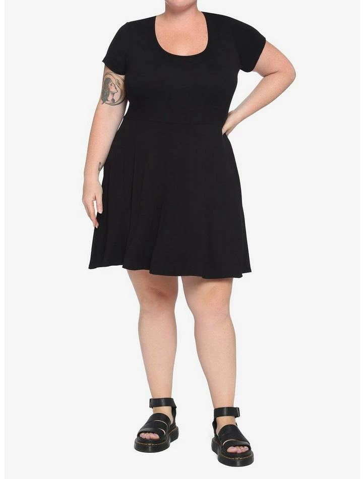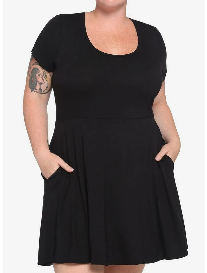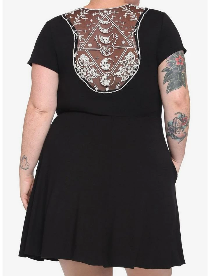 This dress will imbue you with a moonlit glow!ย This comfortable black dress features a lace back with moon phase details and – of course – pockets.
