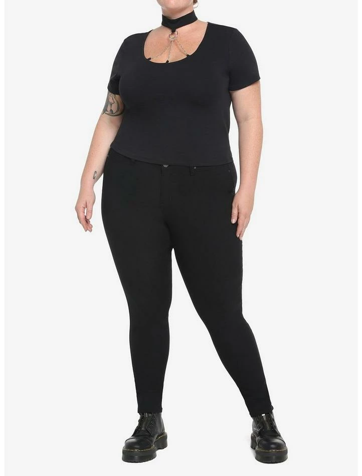 Boring black tees are out. Spicy black tees are in. Grab this version with chains attached to a built-in fabric O-ring choker for an interesting twist on your everyday black tee. Cropped fit.