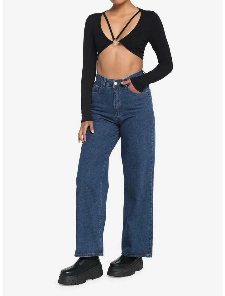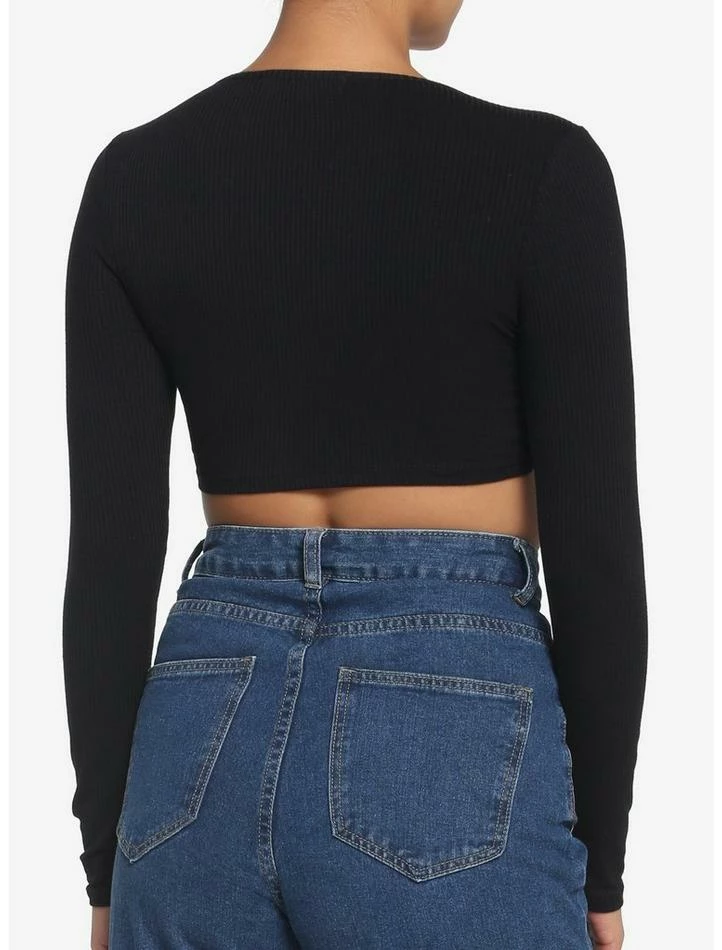Spice things up for summer with this black long-sleeved top! It has a cropped fit and features a deep V-neckline, with straps and silver-tone O-ring detailing.