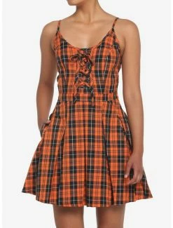 Looking for a new dress that’ll add some Halloween vibes to your look? Orange you glad you came across this one?! Step out in some fall colors with this lace-up dress, featuring an orange & black plaid design all over, with lace-up detailing at the center chest and a pleated skirt. Complete with adjustable cami straps, side zipper closure and pockets.