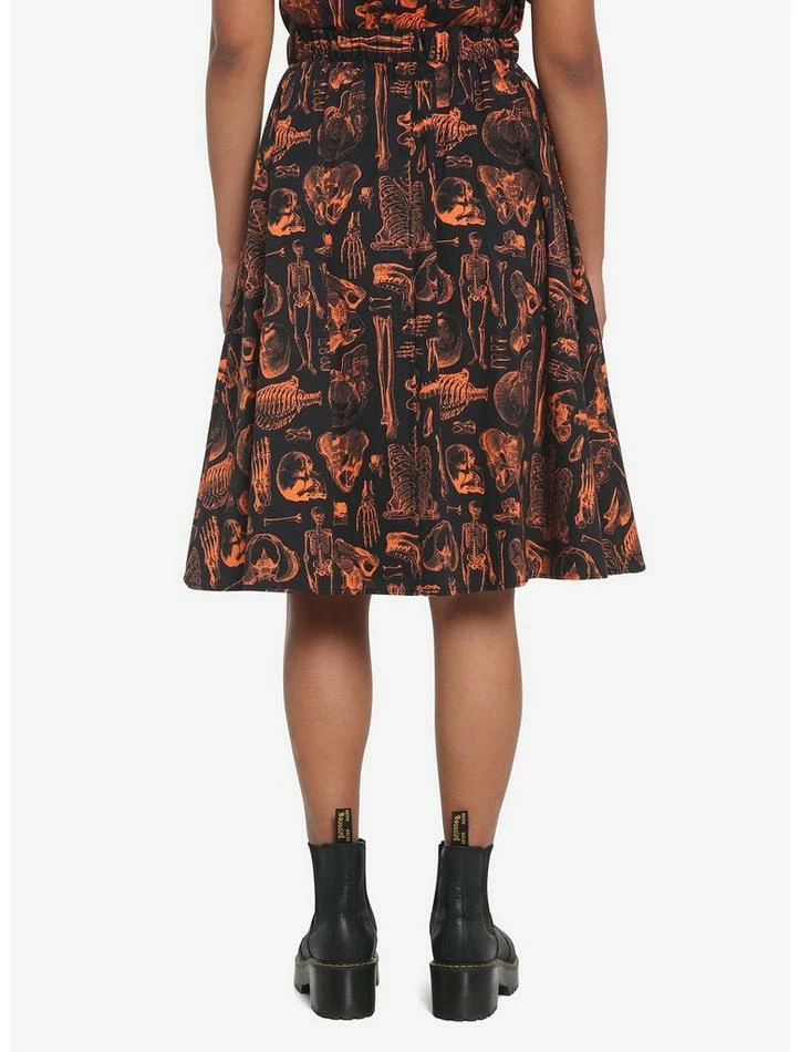 Add some skeletons to your closet with this black and orange retro skirt! It features an allover print of skeleton parts, an elasticated waistband and side seam pockets. Pair it with the matching top to complete your bone-chilling look!