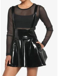 Toughen up in this suspender skirt. Made with bold, black patent faux leather, it has an empire waist and O-ring detail in the back, as well as an exposed zipper.