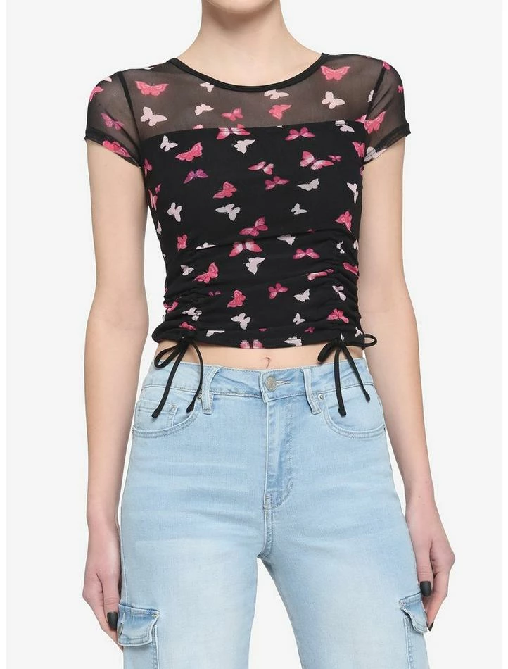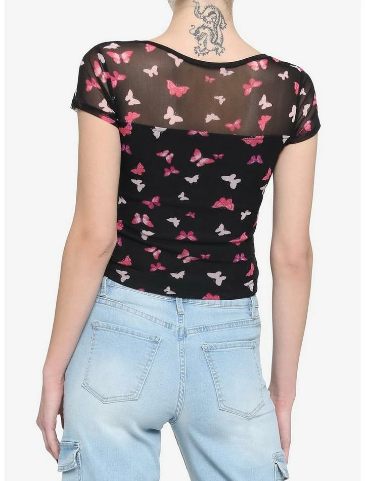 Let your style flutter in this mesh top featuring a pink butterfly print, double ruched tie detailing and black lining.
