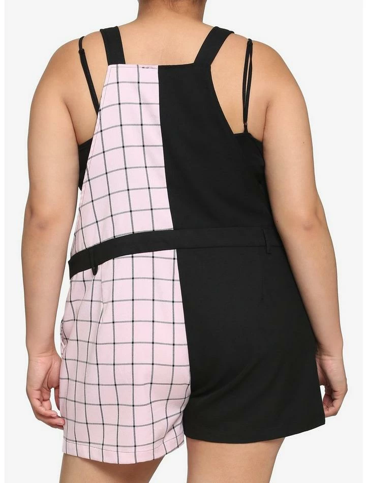 Tired of plain shortalls? Change up your look with this piece! These shortalls feature a split solid black and pink grid print. They come with adjustable buckle straps with grommet detailing and hip pockets. Compete with belt loops, a partial front zipper and side zipper closure.