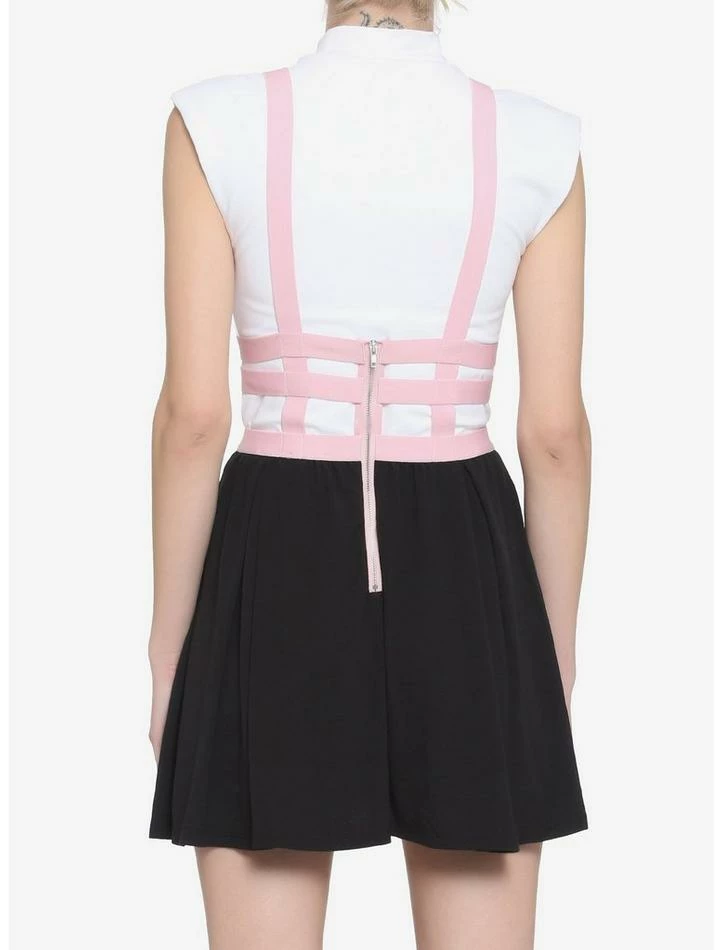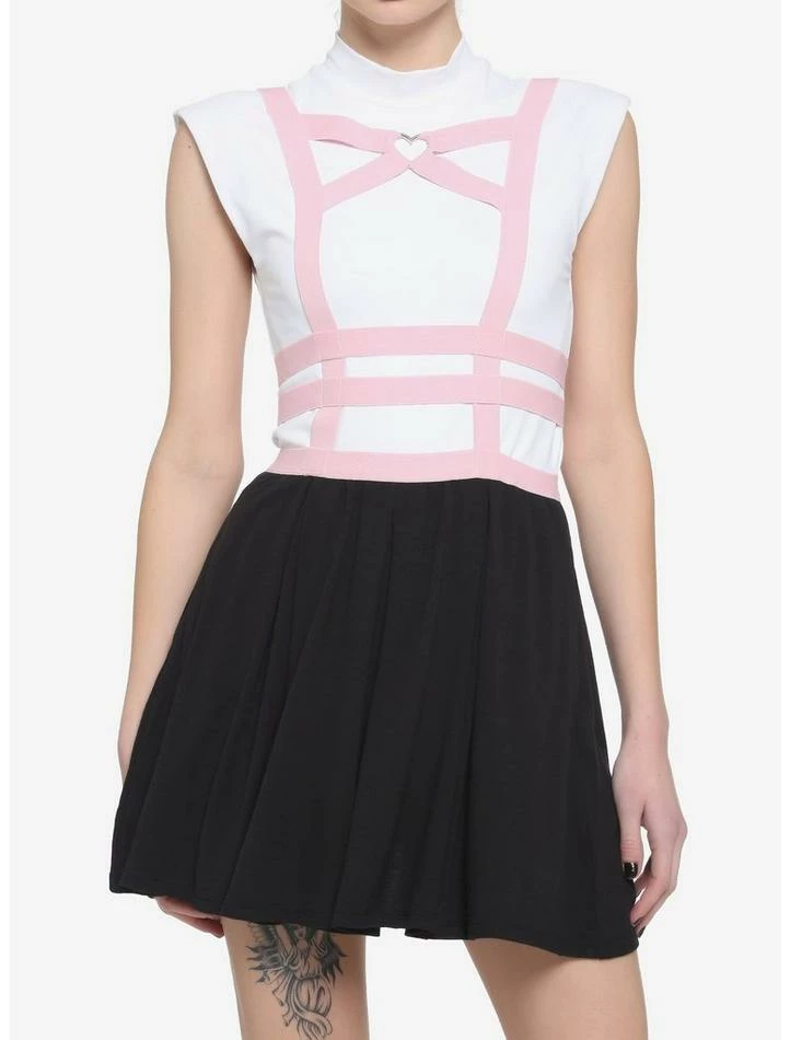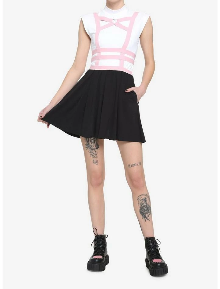 Add some edge to your flirty look with this suspender skirt! Featuring an elastic pink harness with silver-tone, heart-shaped hardware, side seam pockets and back zipper closure.