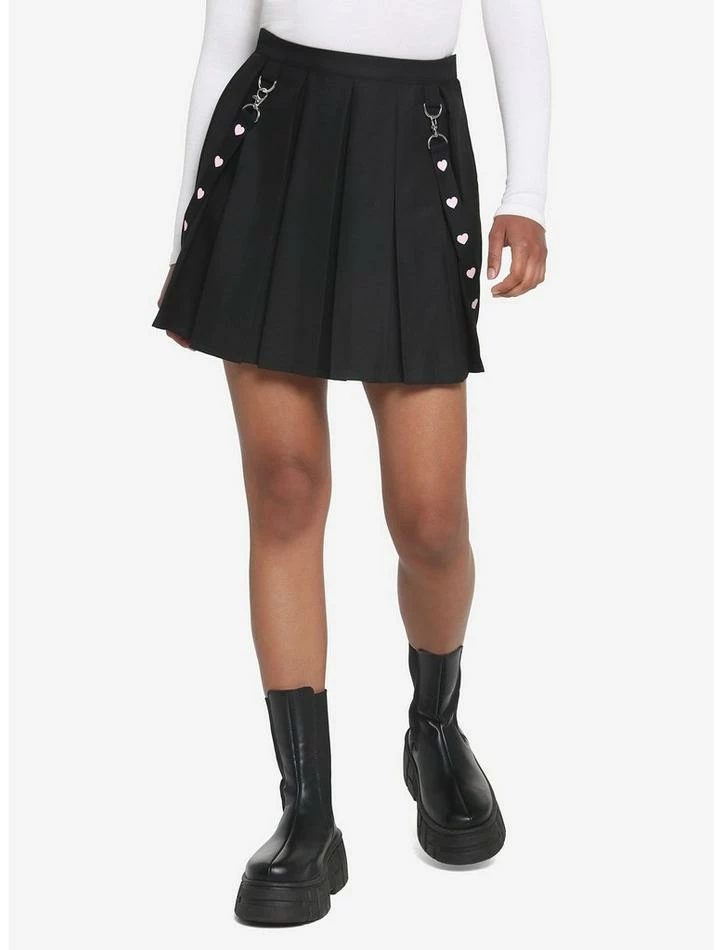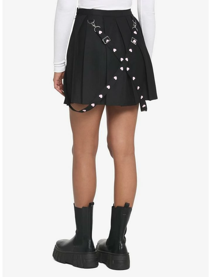This black suspender skirt is giving us serious heart eyes! It comes with super flirty pleats and features removable suspenders with pink heart detailing. Complete with a side zipper closure.