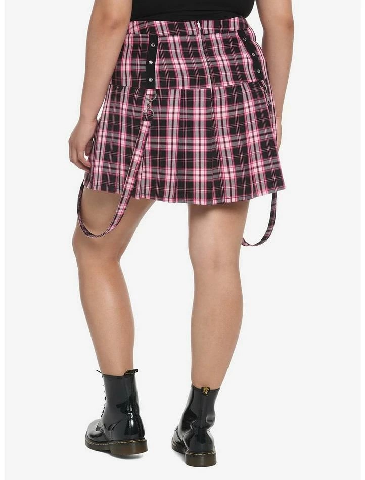 Looking for your next skater boy? Rock this punk-inspired pleated skirt made of black and pink plaid fabric. It comes with grommet detailing and detachable suspenders. Back zipper closure.
