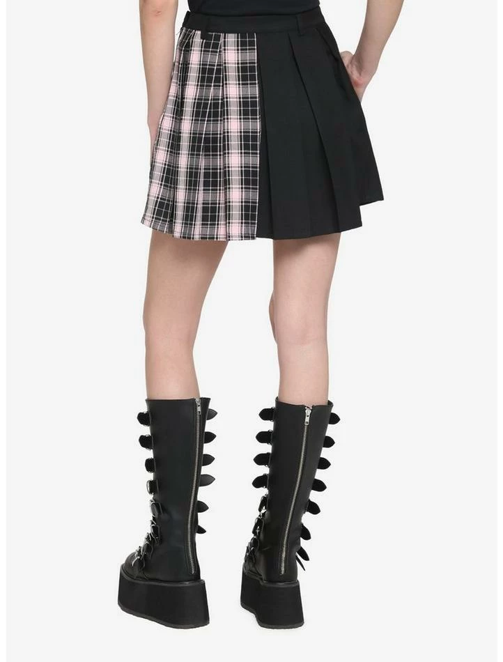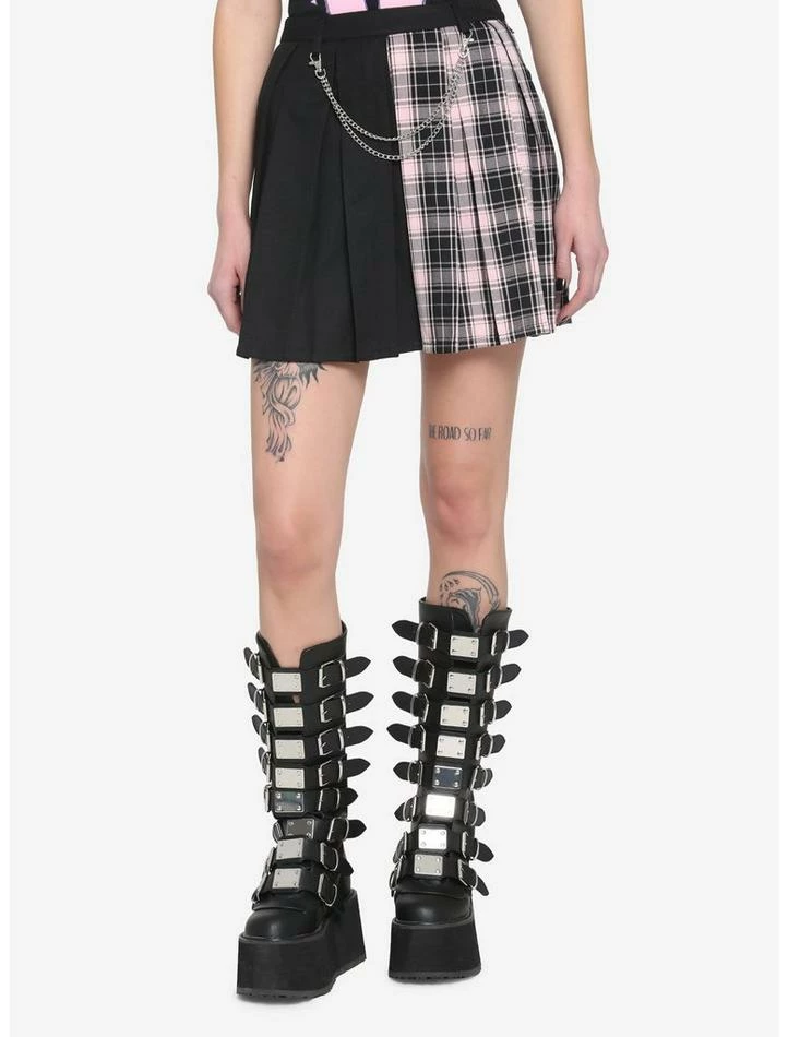 Tired of plain skirts? Grab this lil’ number and make a statement! This pleated skirt features a black and pink plaid split design with side seam pockets. There is a detachable, silver-tone double chain on the front for some extra flare. Side zipper closure.