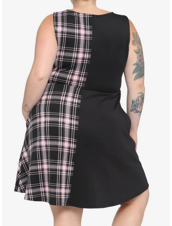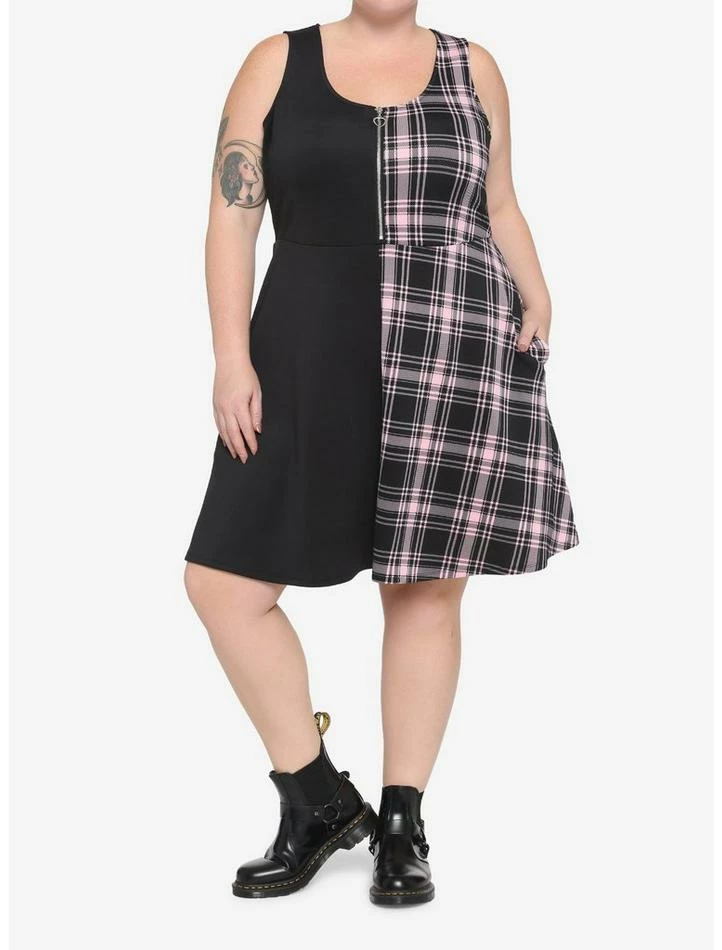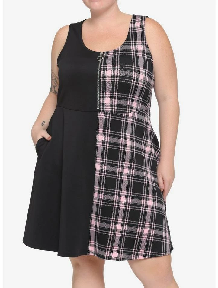 Can’t decide between wearing solids or prints on your date night? Now you don’t have to! This skater dress features a split design of black on one side and pink plaid on the other. There is a partial zipper on the chest with a silver-tone heart zipper pull and side seam pockets.