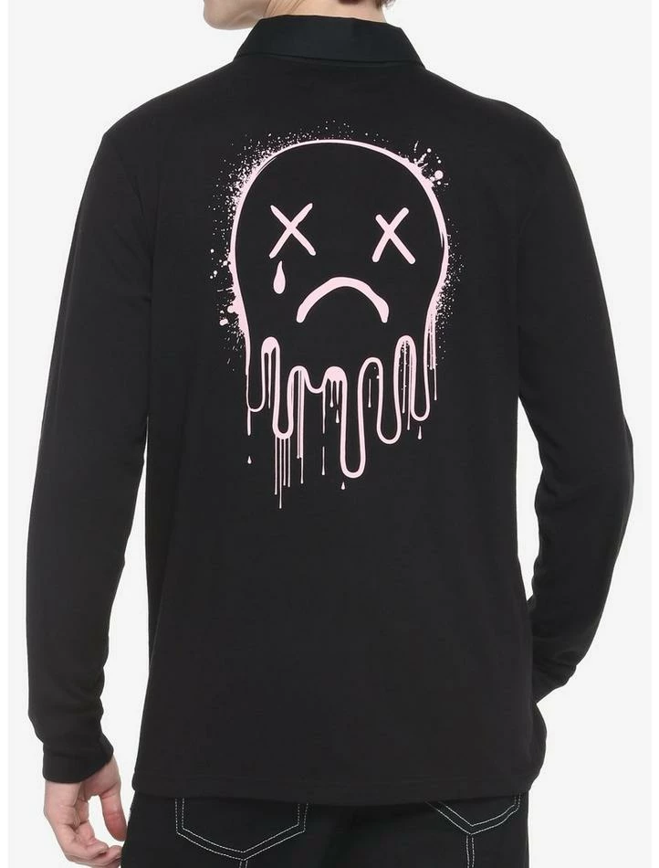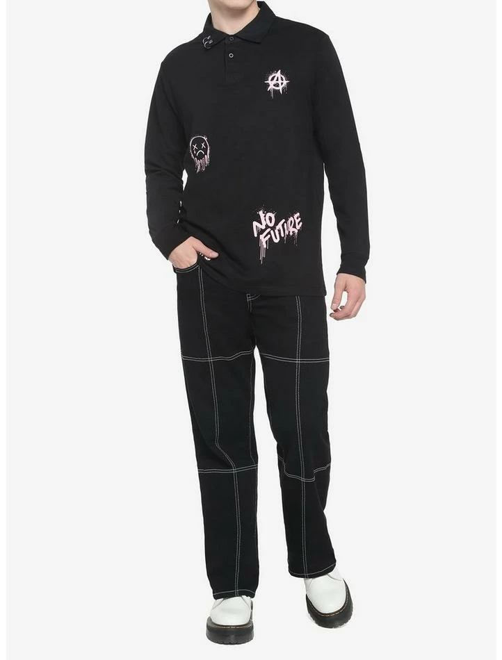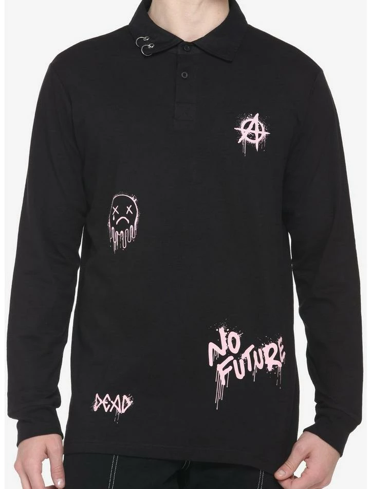 Stay warm without compromising your style! This black, long-sleeved polo is exactly what you need to bring some anarchy to your closet! Comes with pink, punk-inspired icons printed throughout and O-ring detailing at the collar.