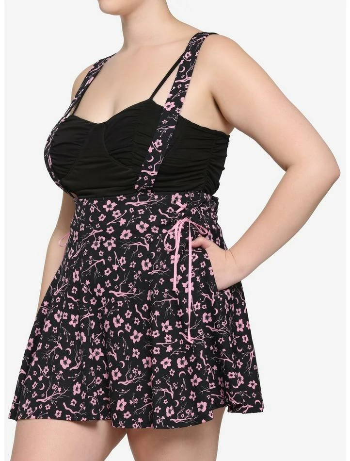 New looks are in bloom. This black suspender skirt features a pink sakura blossom print, pink double lace-up detailing, adjustable straps and pockets.