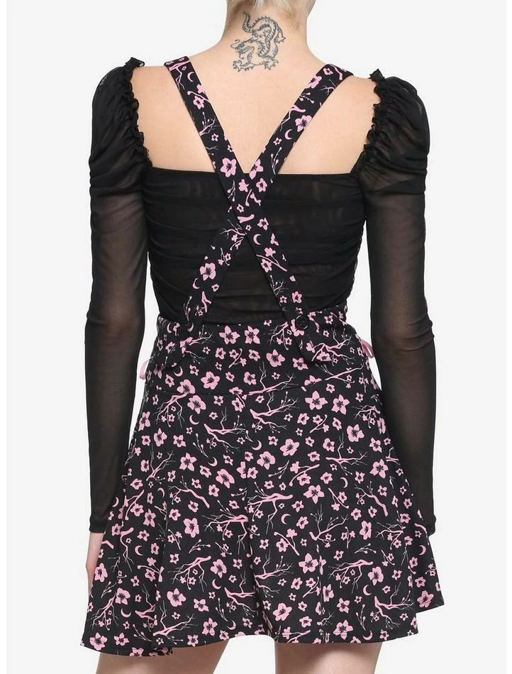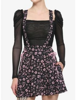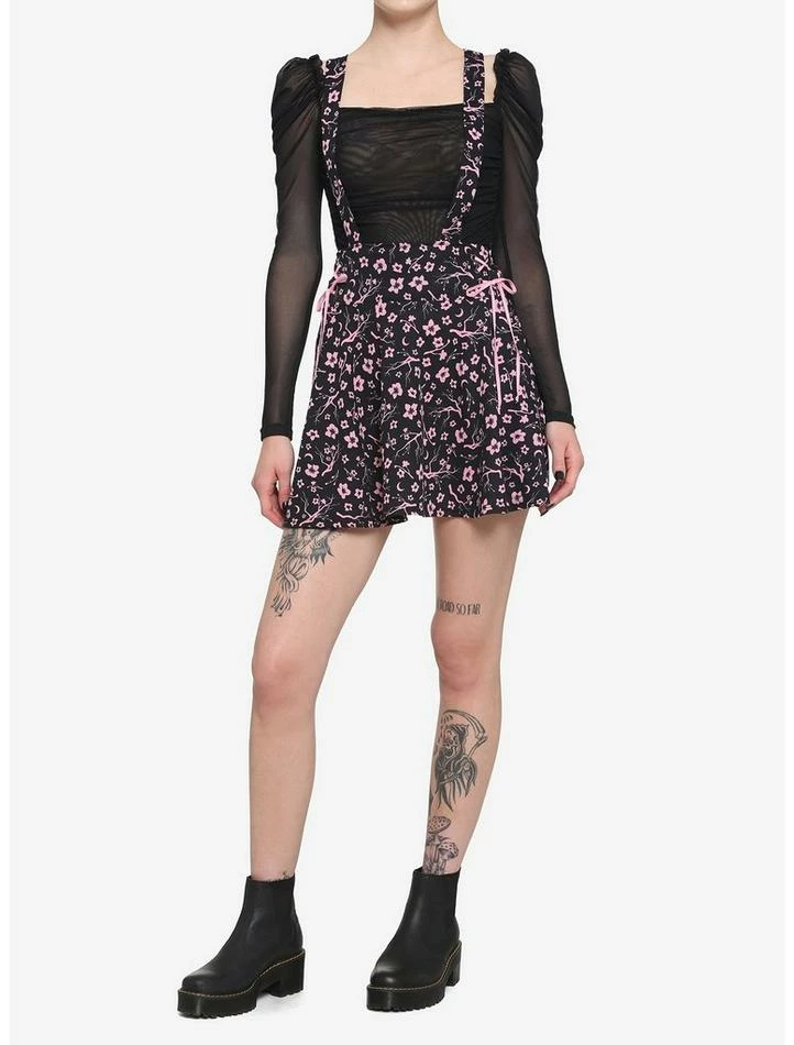 New looks are in bloom. This black suspender skirt features a pink sakura blossom print, pink double lace-up detailing, adjustable straps and pockets.