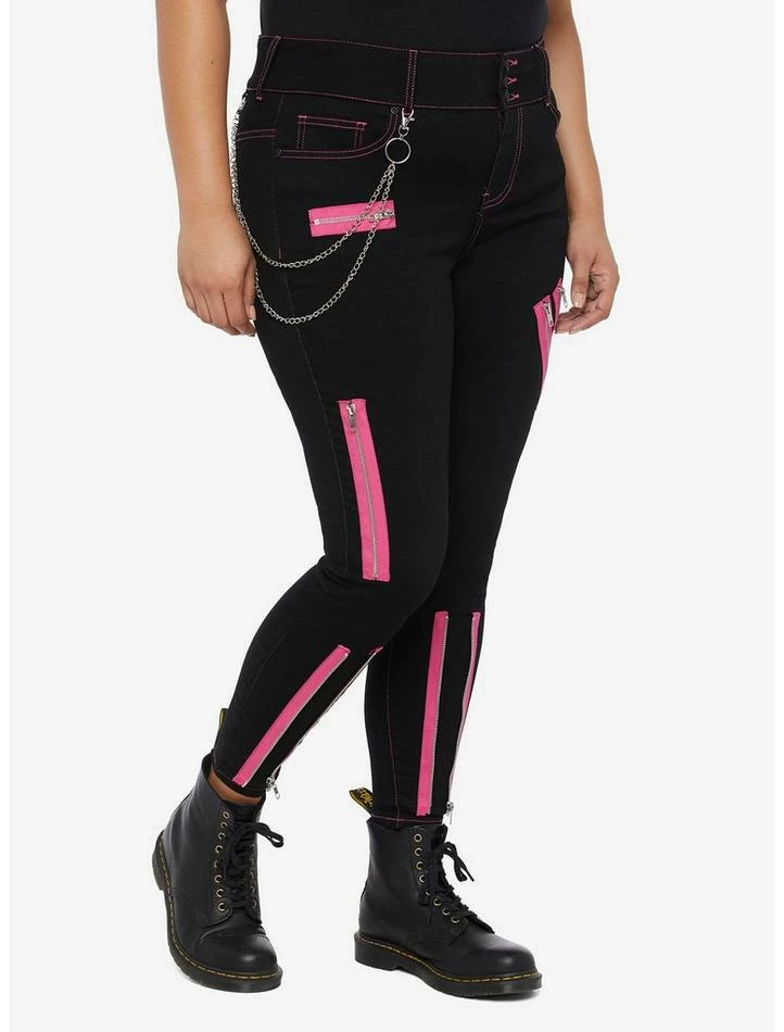 Update your super skinny jeans with some hardware! These black jeans feature pink zipper detailing down both legs and come with a removable side chain. Complete with 5-pocket styling and a triple button closure.