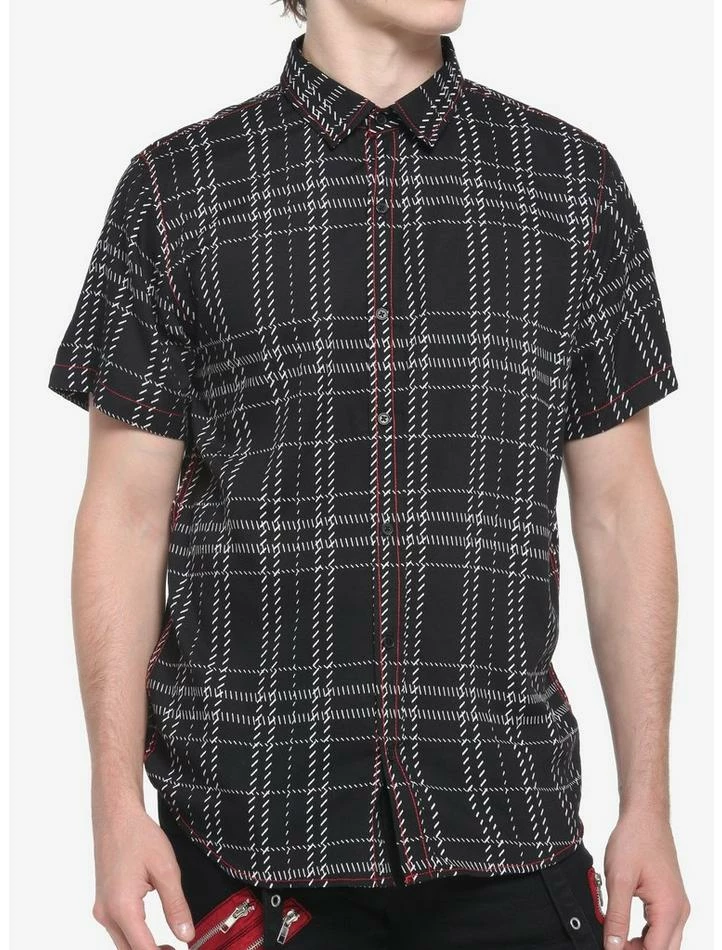 Mix up your stash of button-ups with this black plaid print piece, which has red contrast stitching.