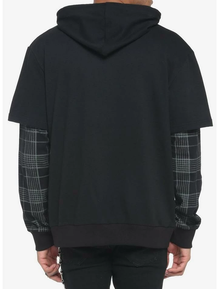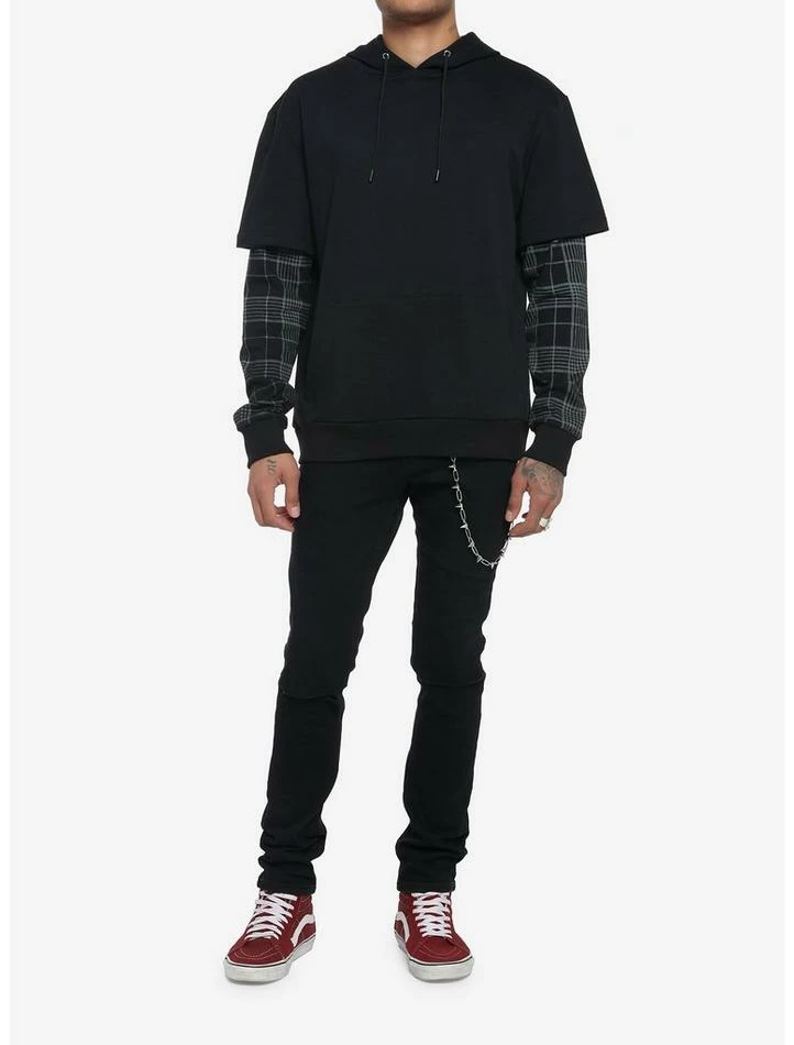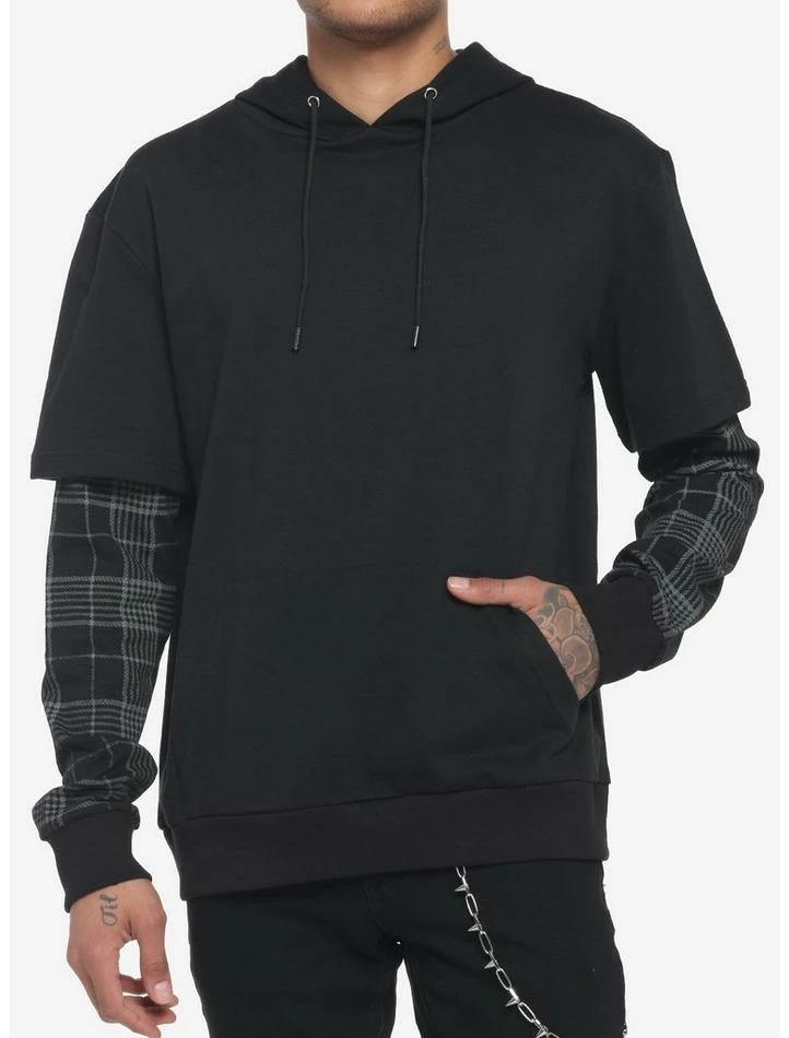 Keep it casual in this twofer hoodie featuring black-and-grey plaid sleeves, a drawstring hood and front kangaroo pocket.