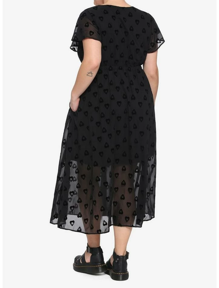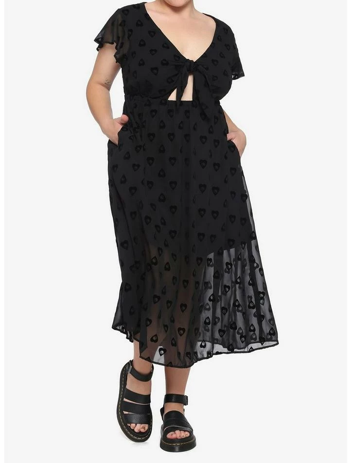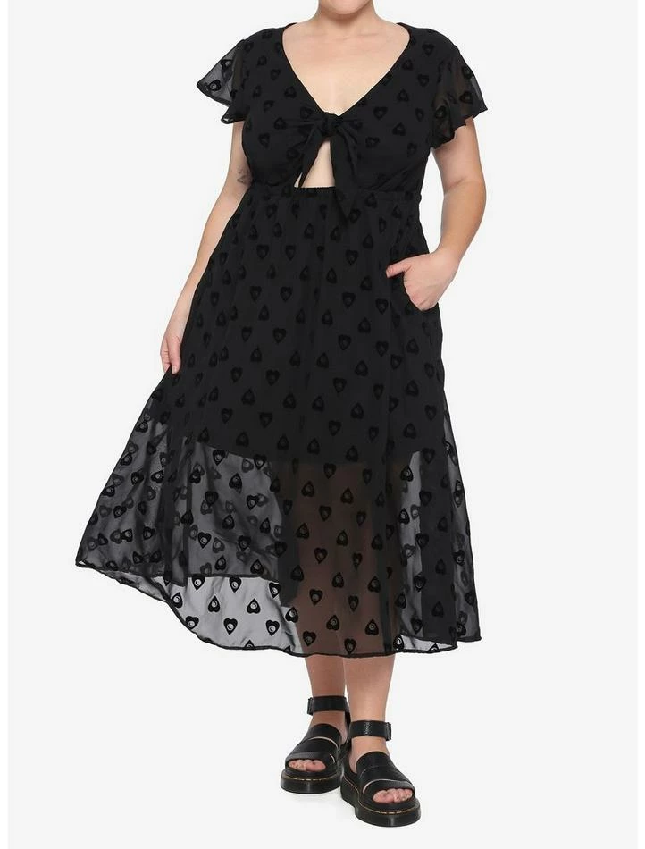 The spirits have spoken! This black midi dress features a flocked planchette pattern, peekaboo tie-front detailing, flutter sleeve and elastic waistband. Oh yes, there’s pockets.