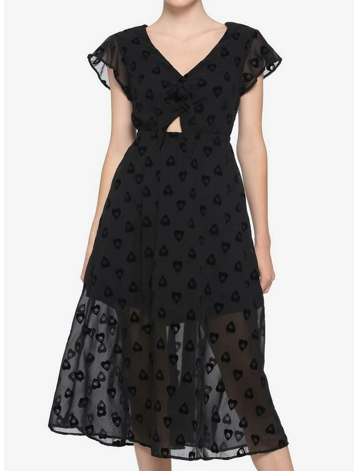 The spirits have spoken! This black midi dress features a flocked planchette pattern, peekaboo tie-front detailing, flutter sleeve and elastic waistband. Oh yes, there’s pockets.