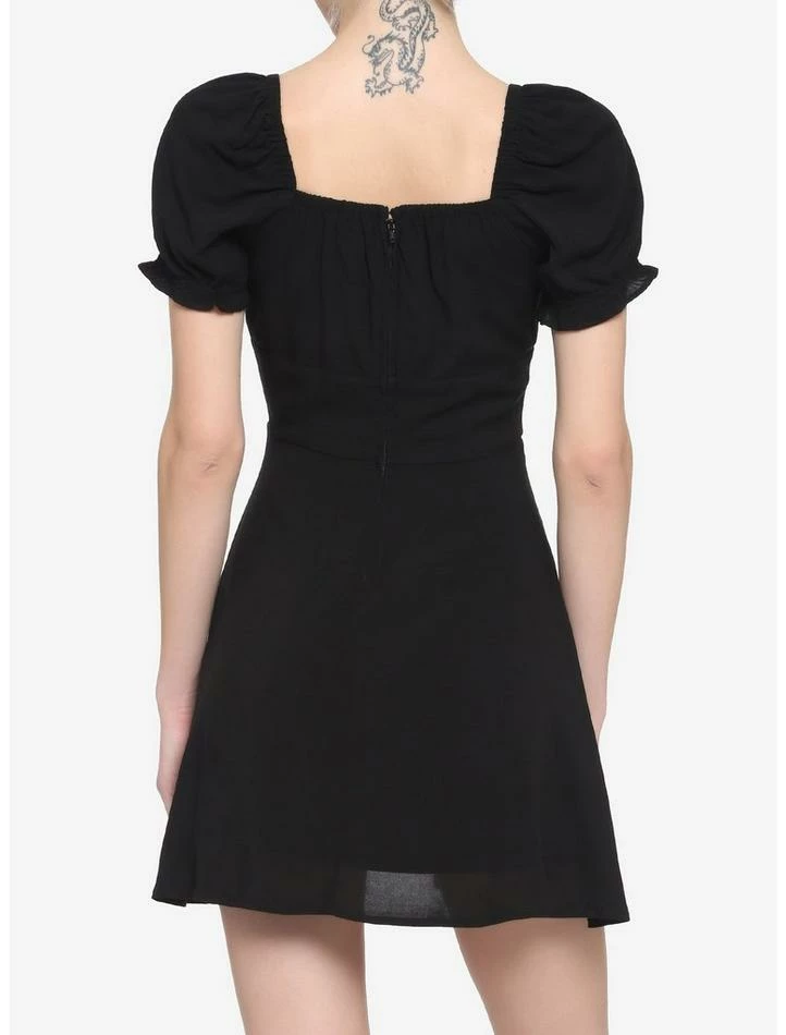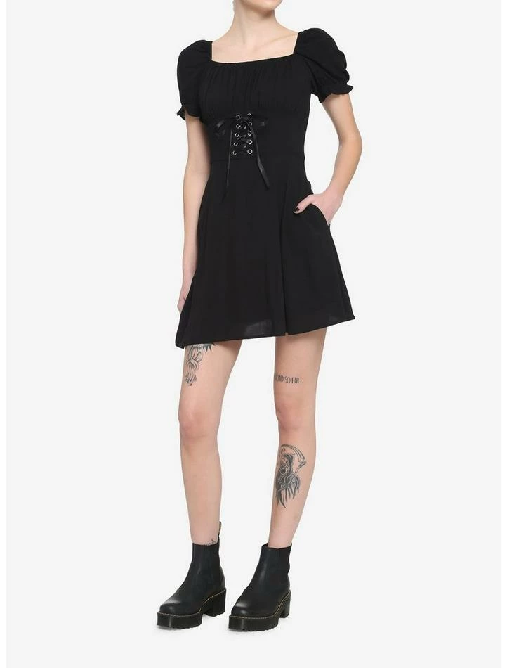 Lookin’ for some dark Ren Faire vibes? We’ve got you covered! This black dress has elastic puff sleeves that can be worn on or off the shoulder for a sweet or sultry look. There is under bust corset detailing, pockets and a back zipper closure.