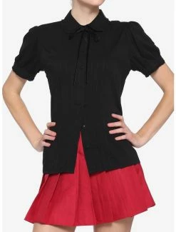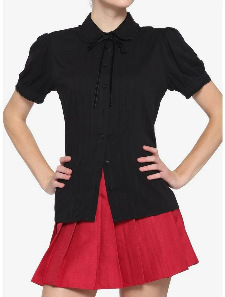 With heart-shaped buttons, fringed collar and allover black, this button-up is the perfect marriage of dark and cute. Features puff sleeves, front pleating, stretch fabric and a tie-around neck.