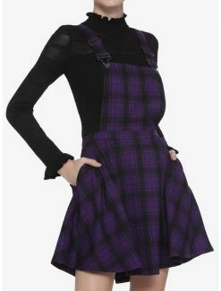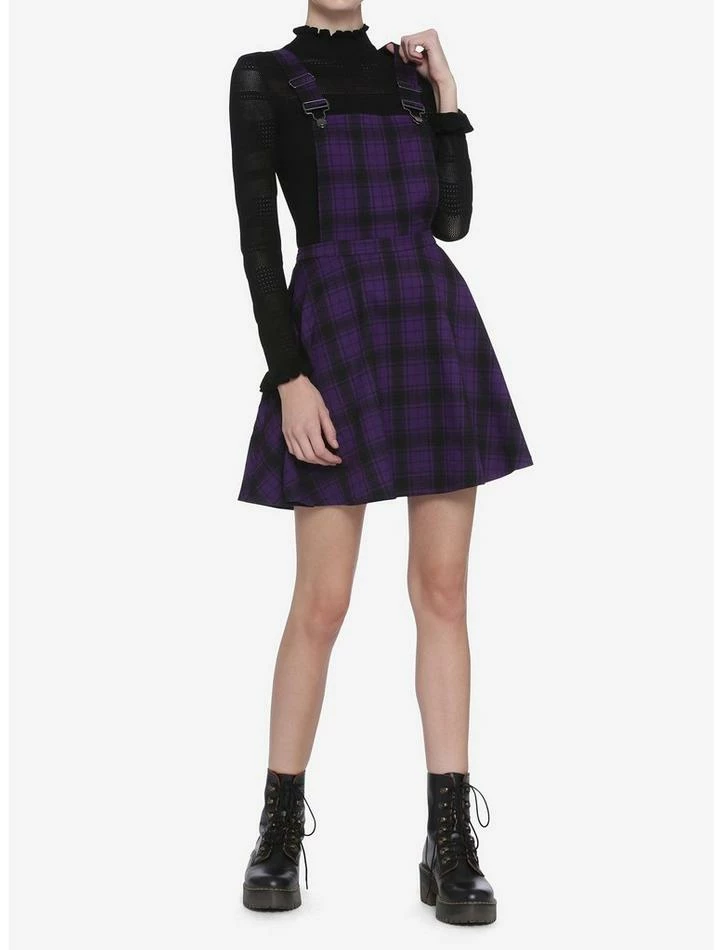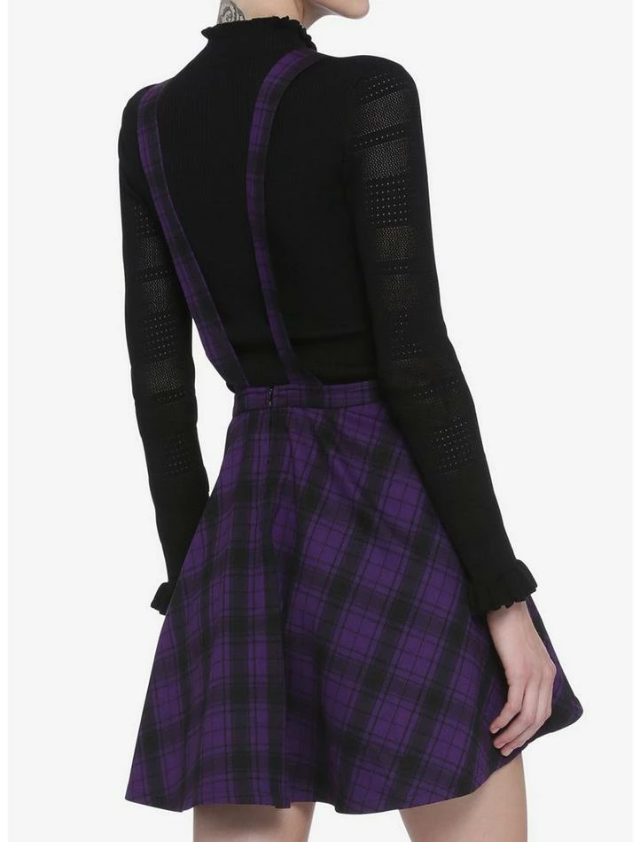 Which witchy look do you wish to wear today? This black and purple plaid skirtall covers all the bases! Featuring pockets, a back zipper and crossover adjustable straps.
