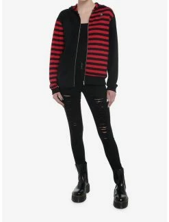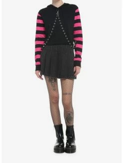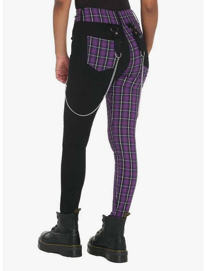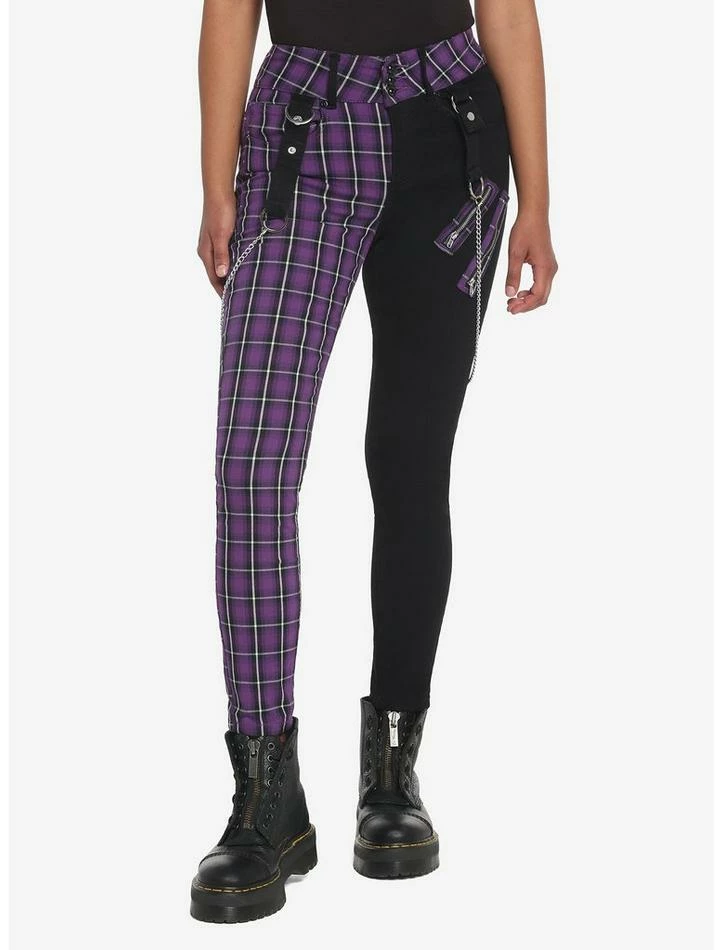 Elevate your jeans with a split design and hardware! These black and purple plaid split skinny jeans feature zipper detailing on the thigh and come with removable, silver-tone chains. Complete with 5-pocket styling and a triple button and zipper closure.