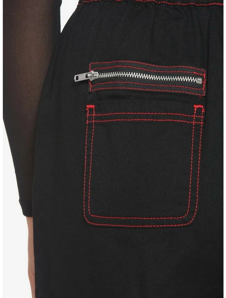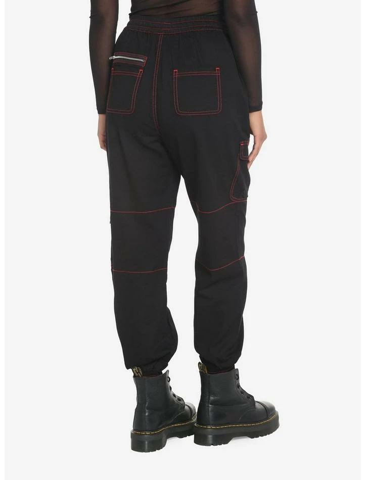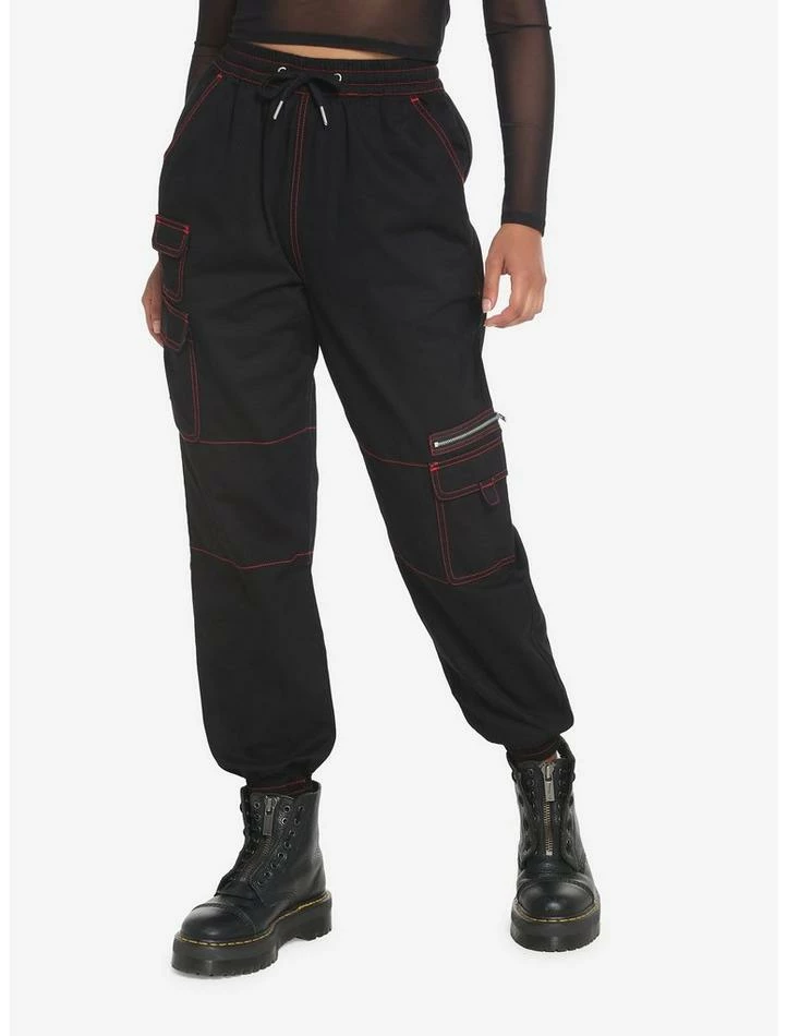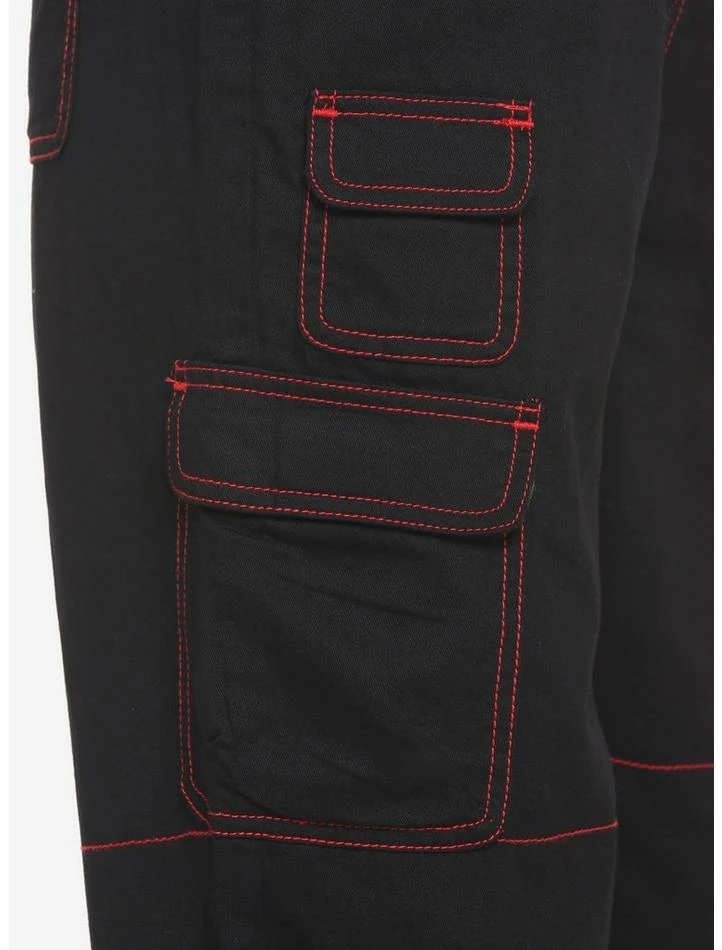 ย We live in a world where cargo pants and jogger pants co-exist harmoniously — as evidenced by this pair! They’re black with red contrast stitching, plus multiple thigh pockets, an elasticated drawstring waistband and elasticated leg openings.