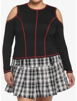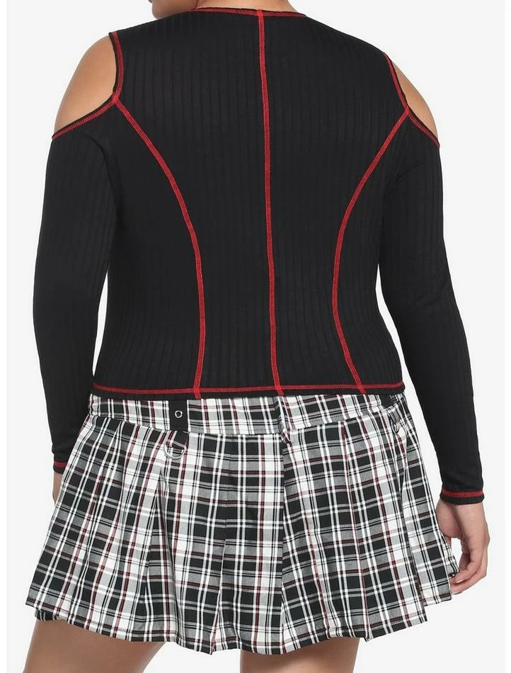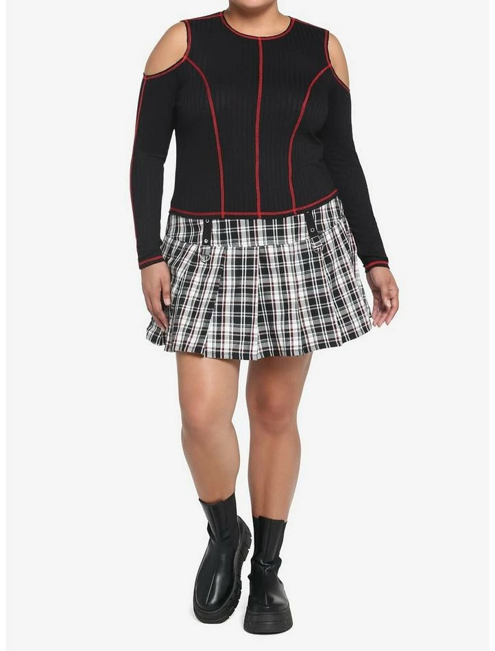 Keep your punk aesthetic going strong in this ribbed long-sleeve! It has a cropped fit and comes with red contrast stitching and cold shoulder detailing. Perfect for pairing with a skirt or jeans!