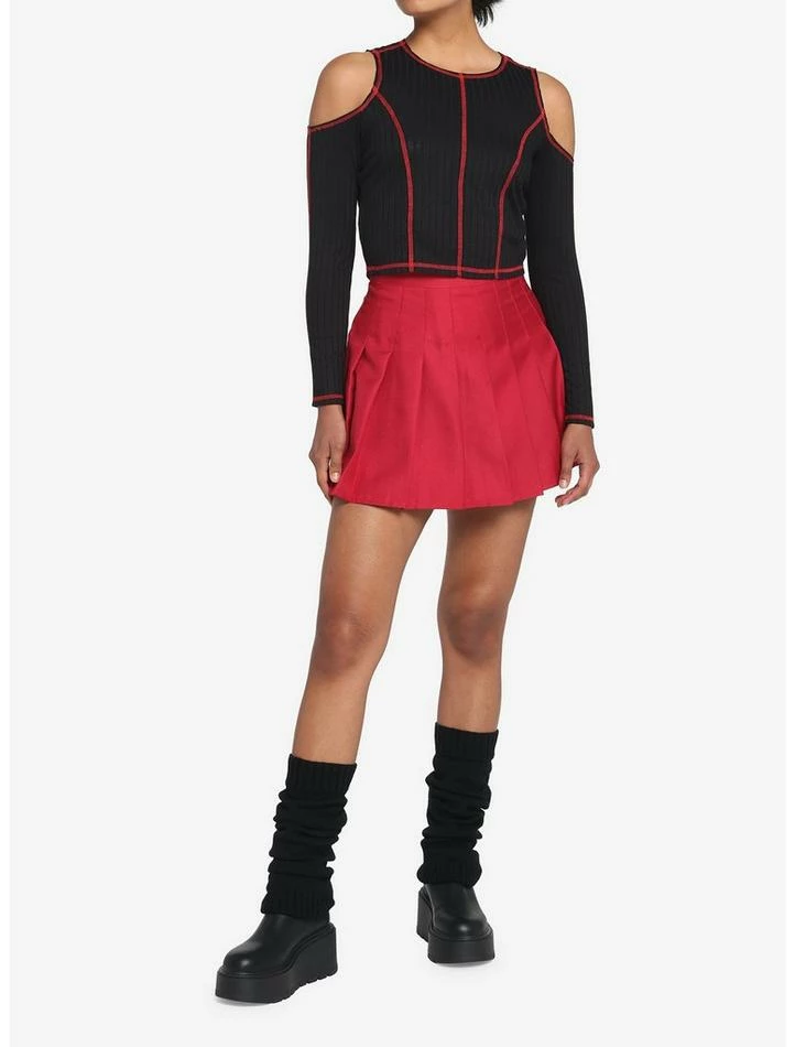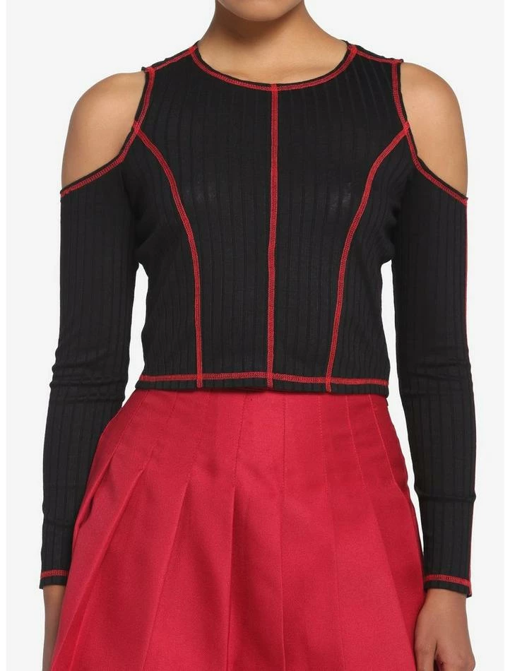 Keep your punk aesthetic going strong in this ribbed long-sleeve! It has a cropped fit and comes with red contrast stitching and cold shoulder detailing. Perfect for pairing with a skirt or jeans!