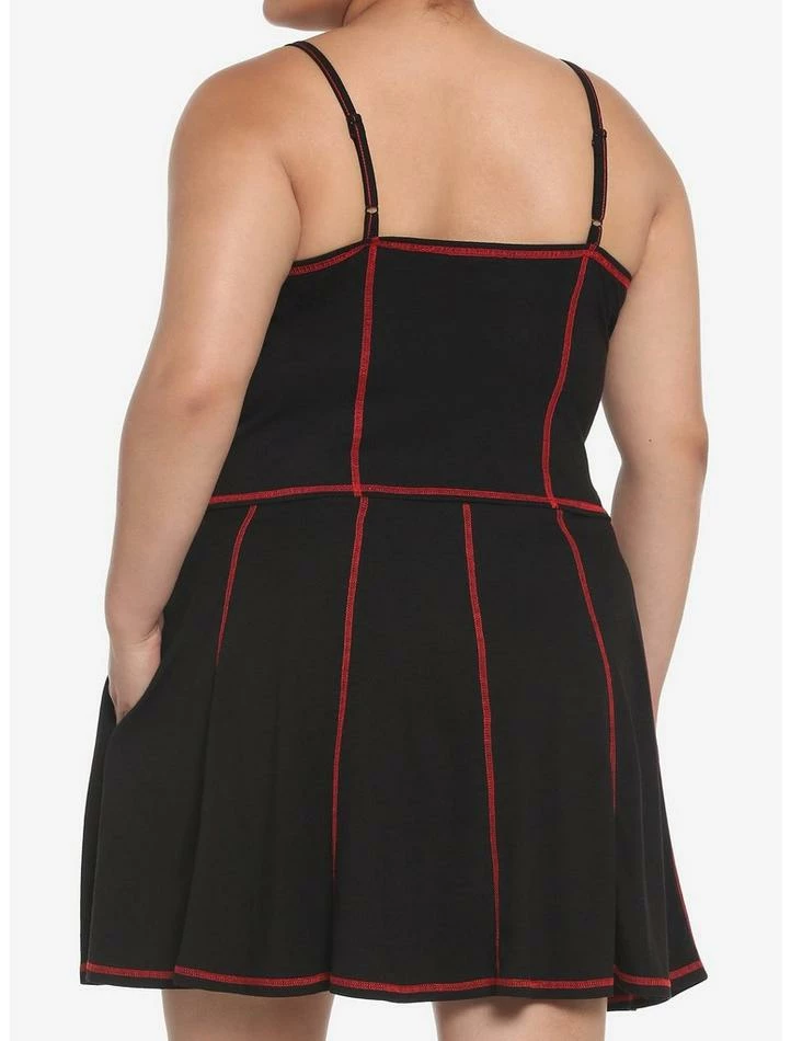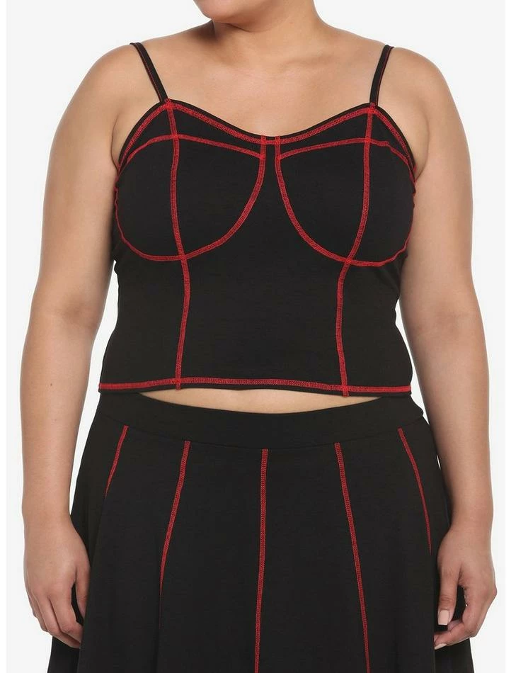 Black and red is the best color combo. This black tank top featuring featuring a corset body and red contrast stitching.
