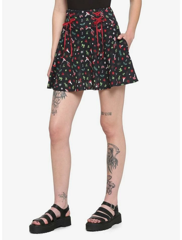 Take a stroll through a flower field in this black skater skirt featuring a red mushroom, flower and bugs print, red lace-up detailing and pockets.