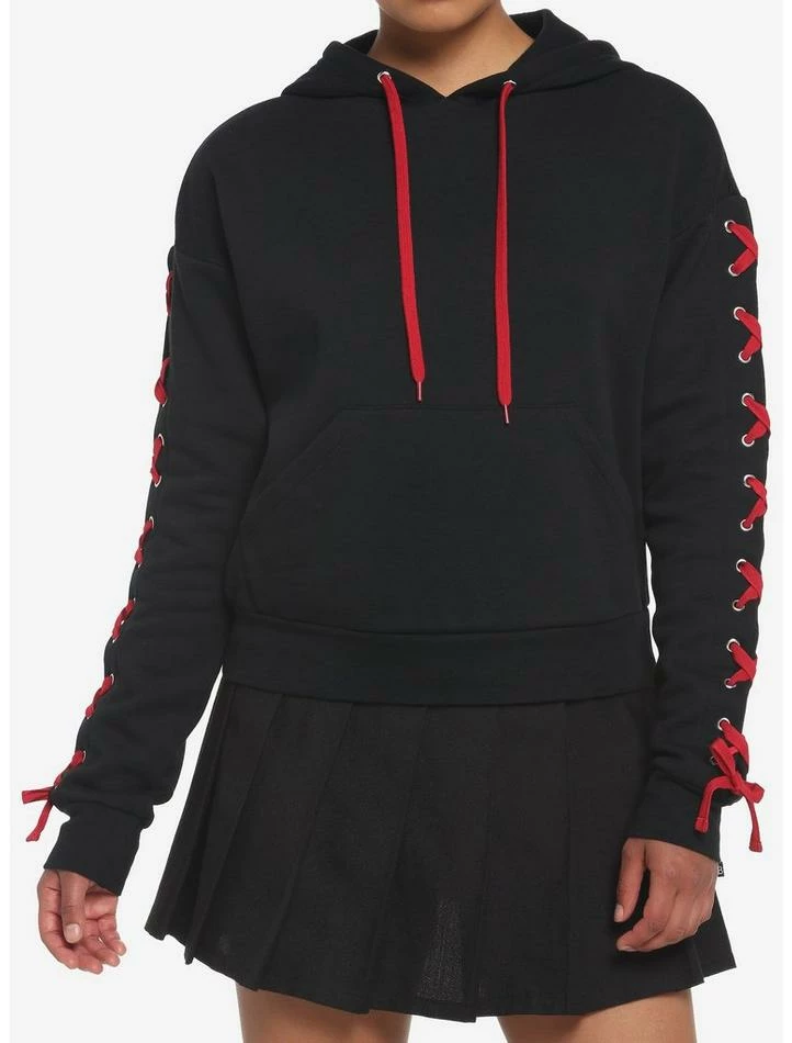 Give off “it’s not a phase” vibes with this hoodie! It’s black with red lace-up detail on the sleeves, plus a hood with red drawstrings and a kangaroo pocket.