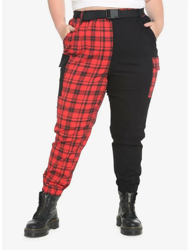 Your cargo joggers just got a whole lot edgier! This pair of joggers is split down the middle, half solid black and half red plaid, with contrasting utility pockets on both sides. Comes with hip pockets and a removable utility buckle belt. Elastic waistband and ankle cuffs.