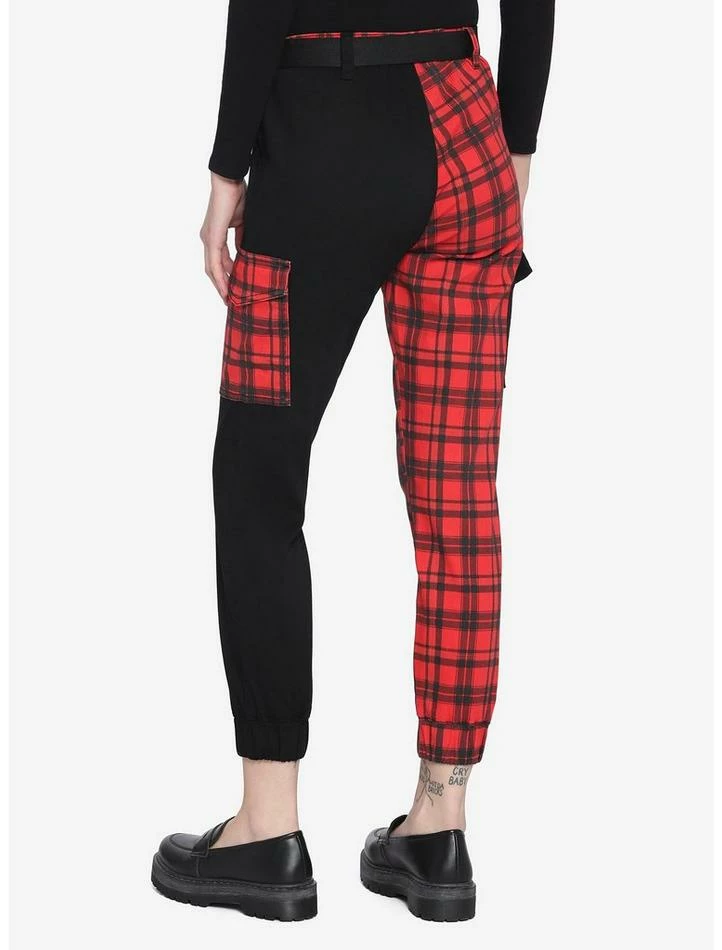 Your cargo joggers just got a whole lot edgier! This pair of joggers is split down the middle, half solid black and half red plaid, with contrasting utility pockets on both sides. Comes with hip pockets and a removable utility buckle belt. Elastic waistband and ankle cuffs.