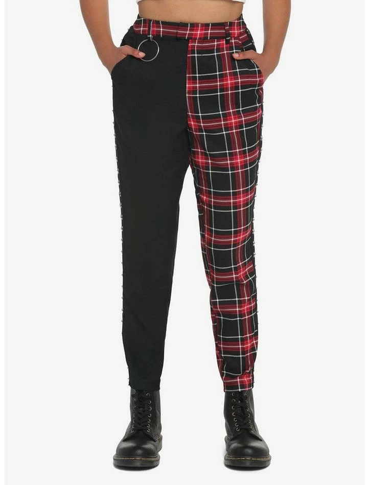 Plaid and hardware is the perfect combo for any punk look! These pants feature a black and red plaid split design, with hook-and-eye detailing down the sides. Plus, O-ring detailing and a half elasticated waistband.