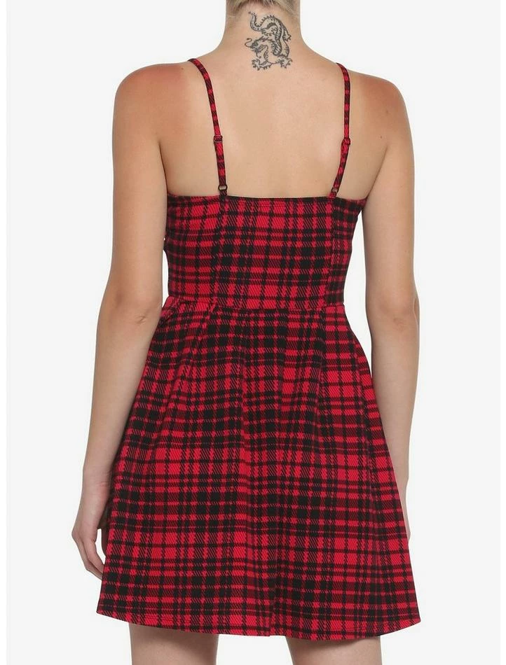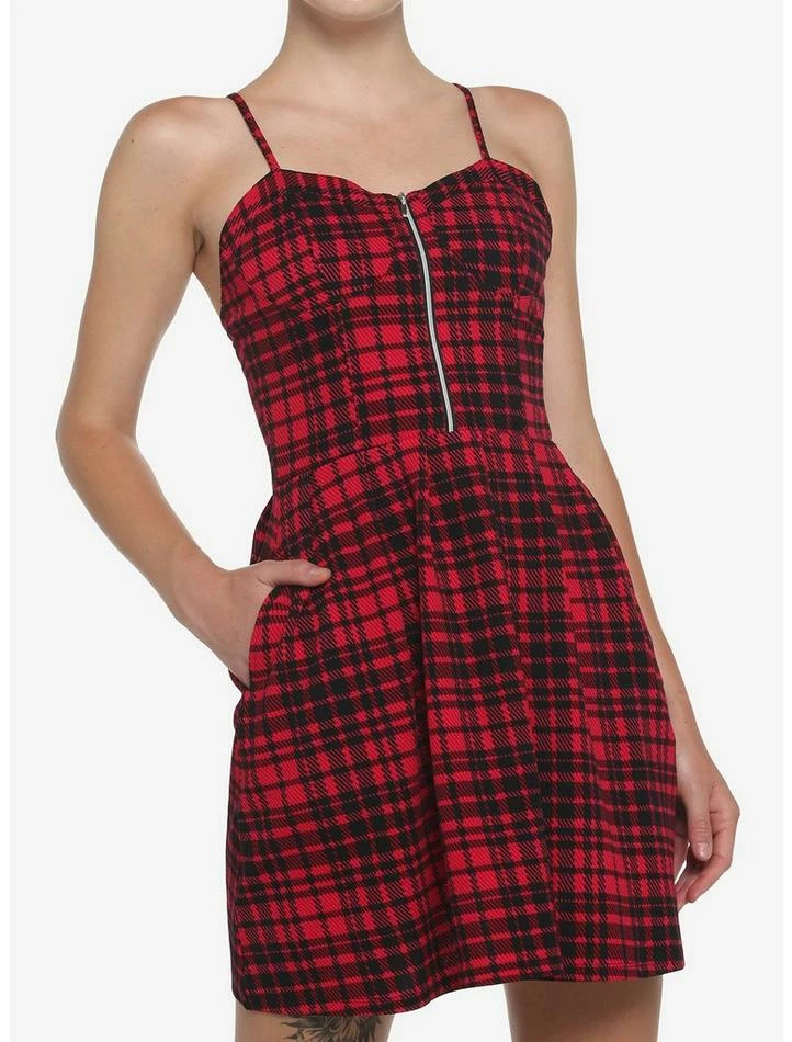 The perfect staple piece in your closet! This dress features a black and red plaid print, adjustable spaghetti straps, front zipper detail and pockets.